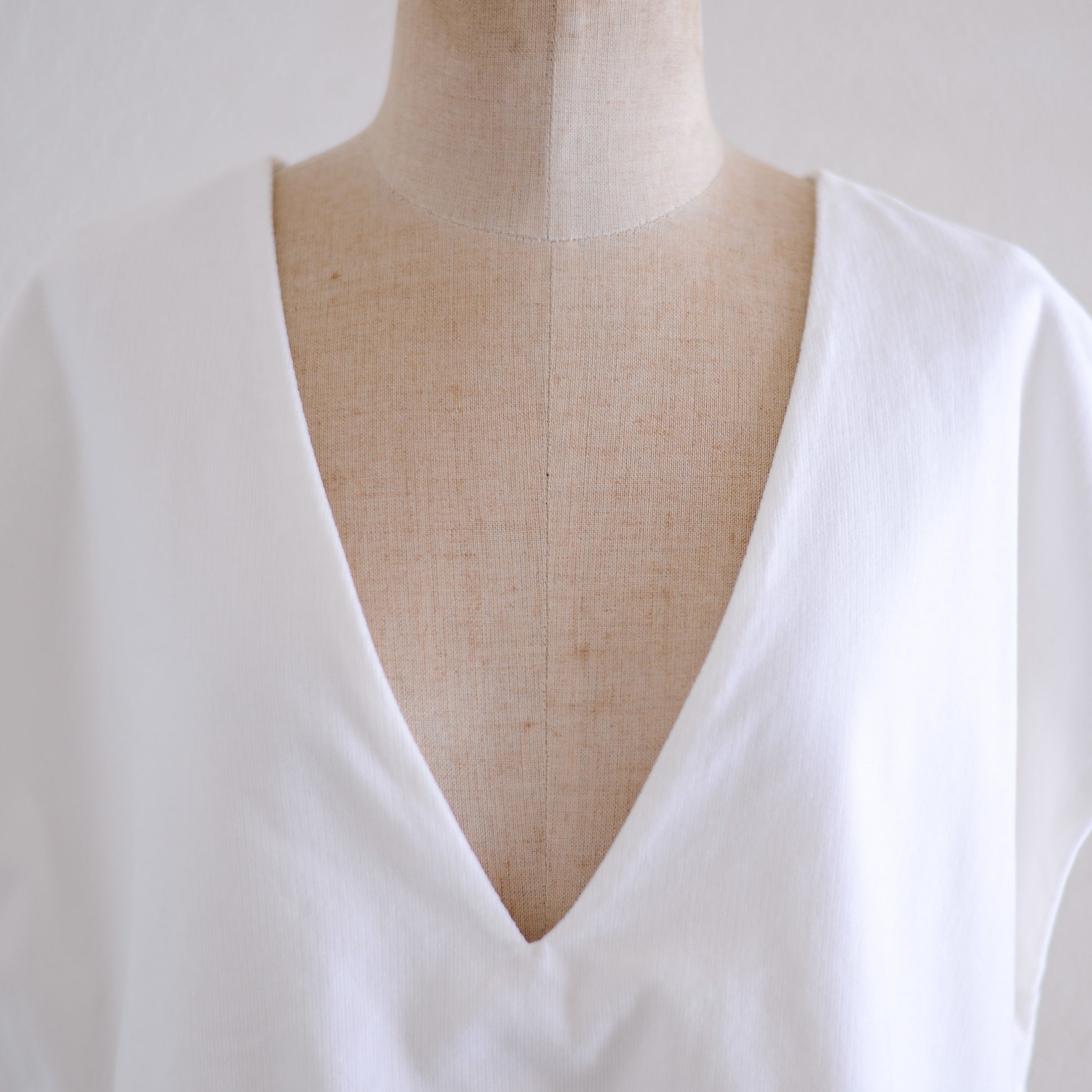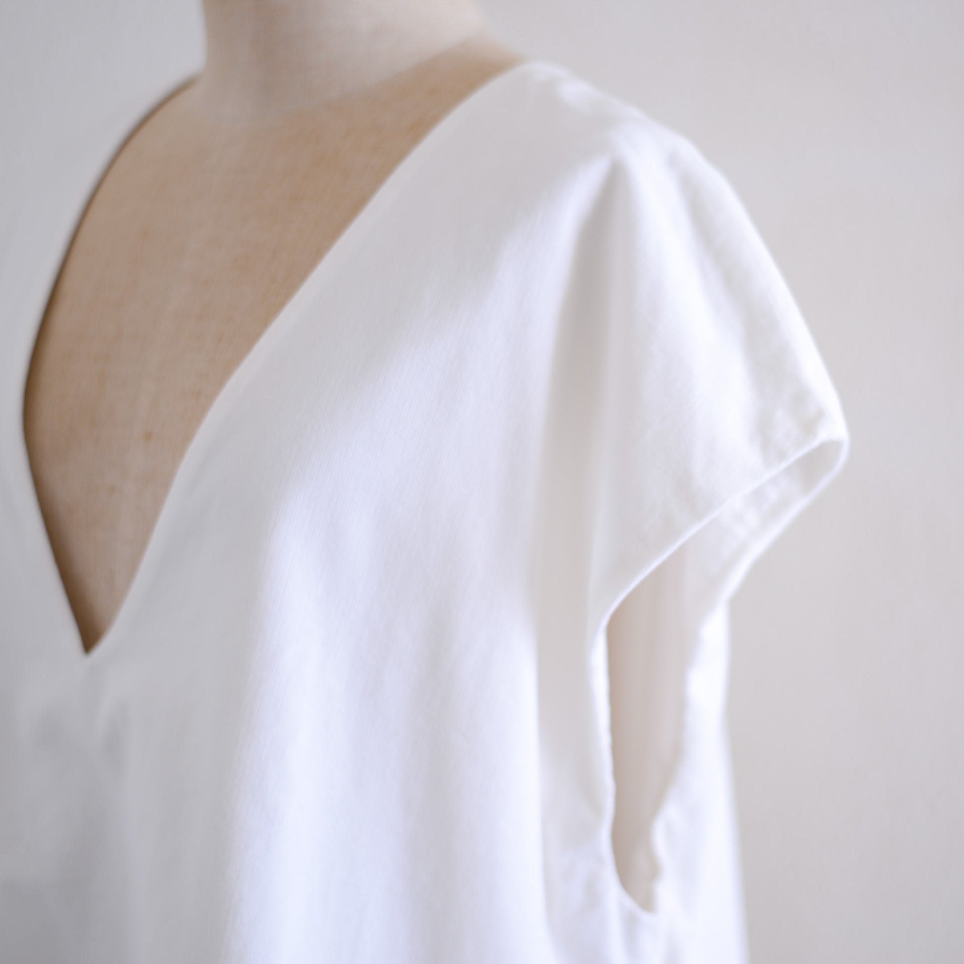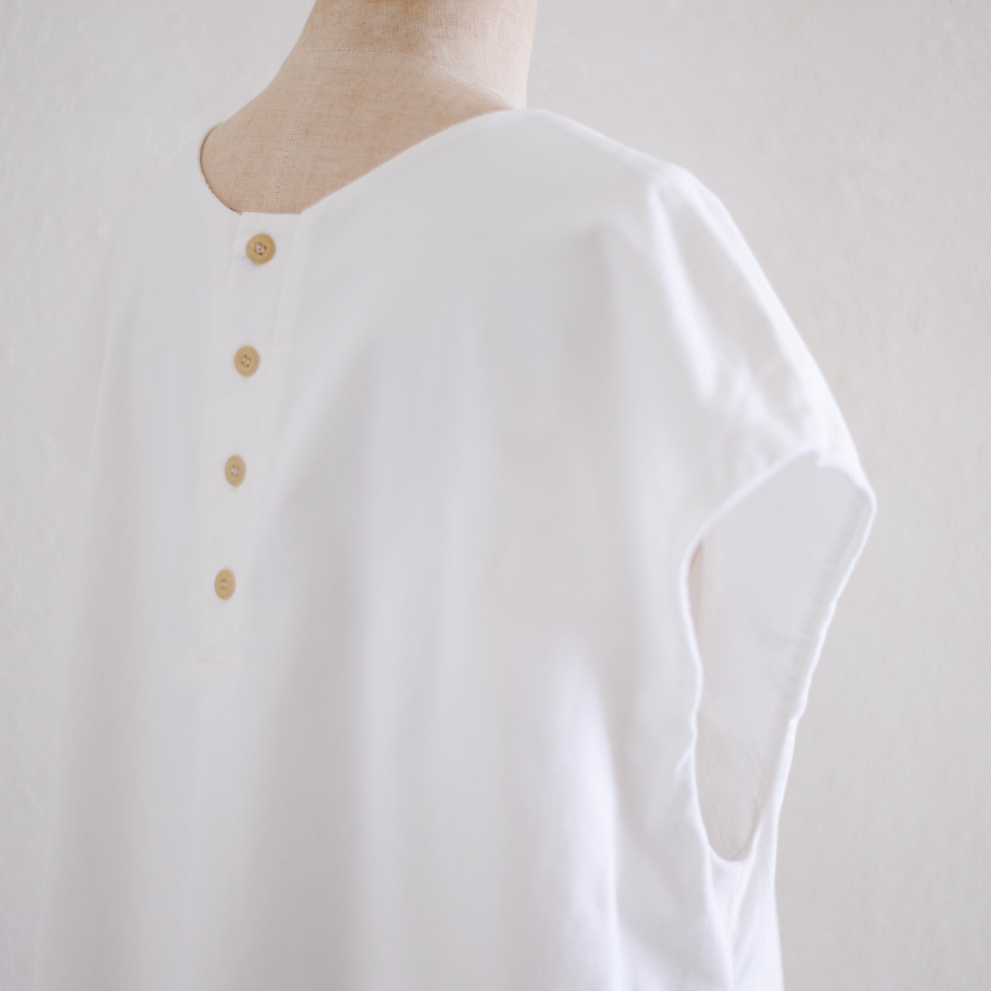袖は肩をそっと覆い、二の腕に少しかかるくらいの丈感となっています。