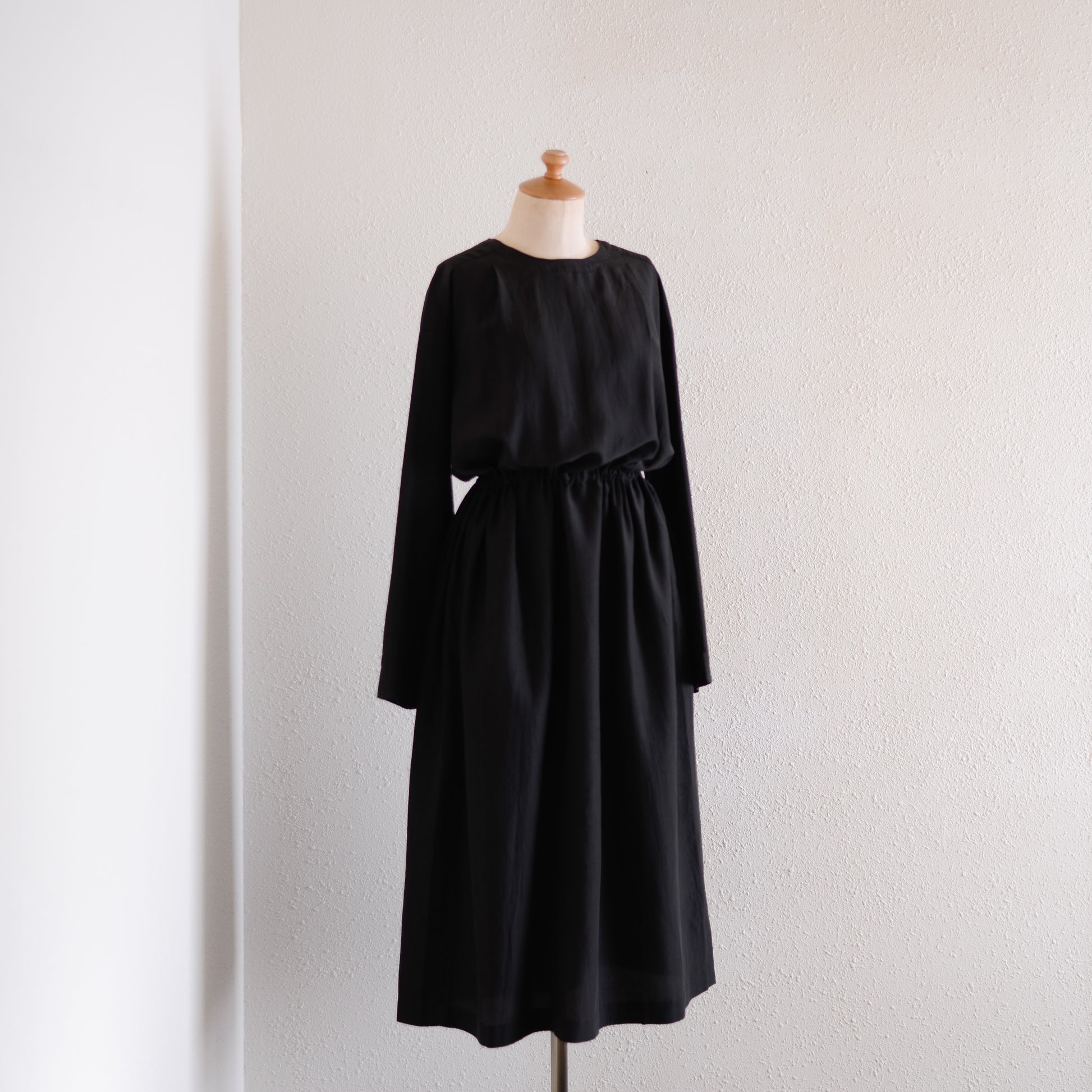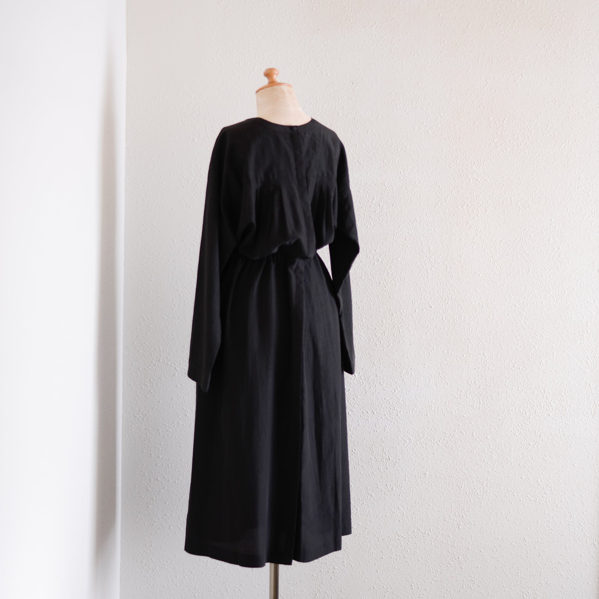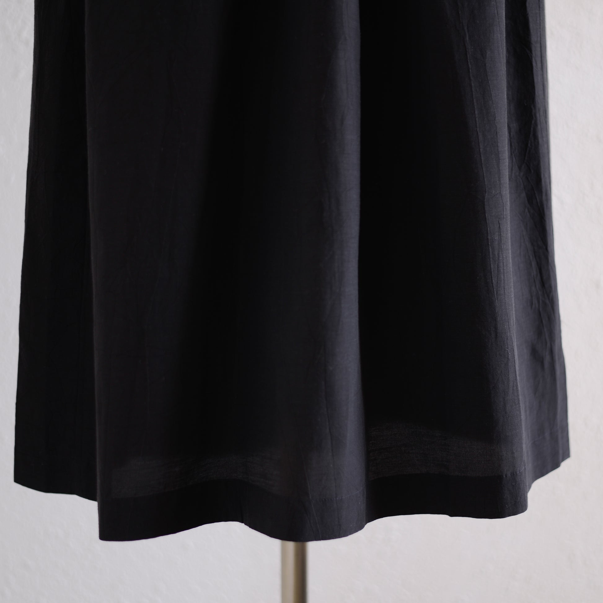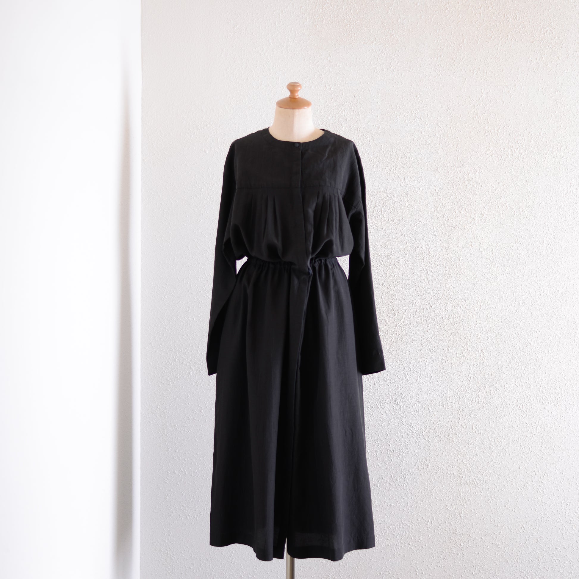 The waist can be adjusted with the inner string; when tightened it creates a well-defined, three-dimensional silhouette, and when worn loose it accentuates the straight vertical lines.