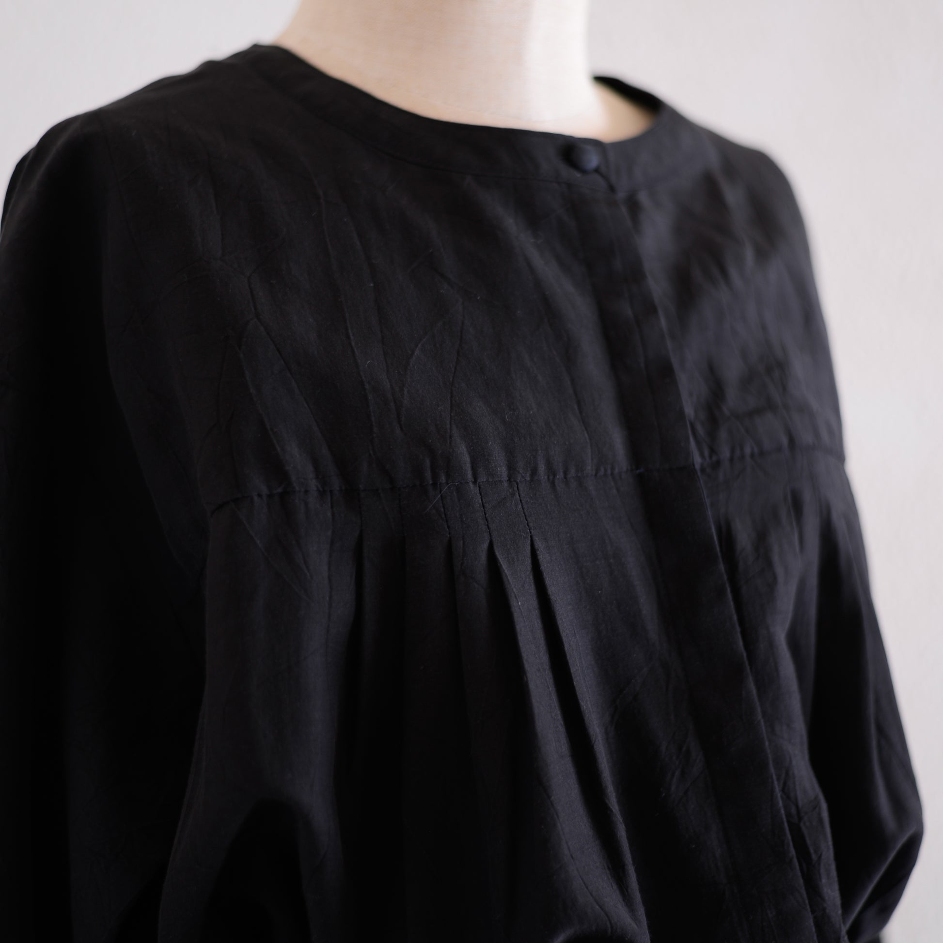 The other side has a concealed placket below the first button, allowing it to be fully opened , and the tucks spread evenly from the chest, creating an airy shape .