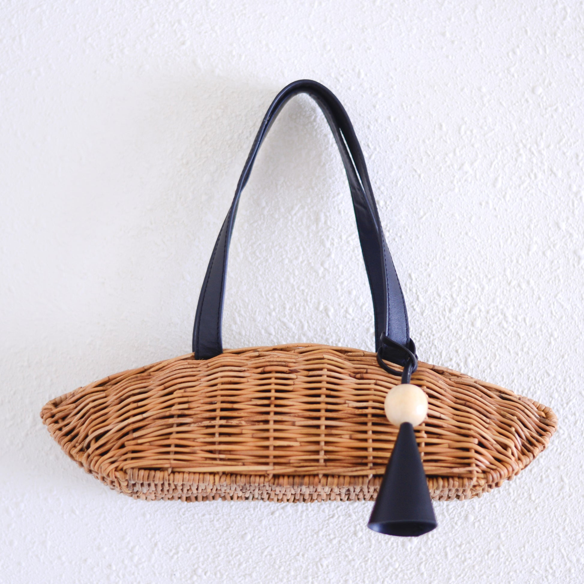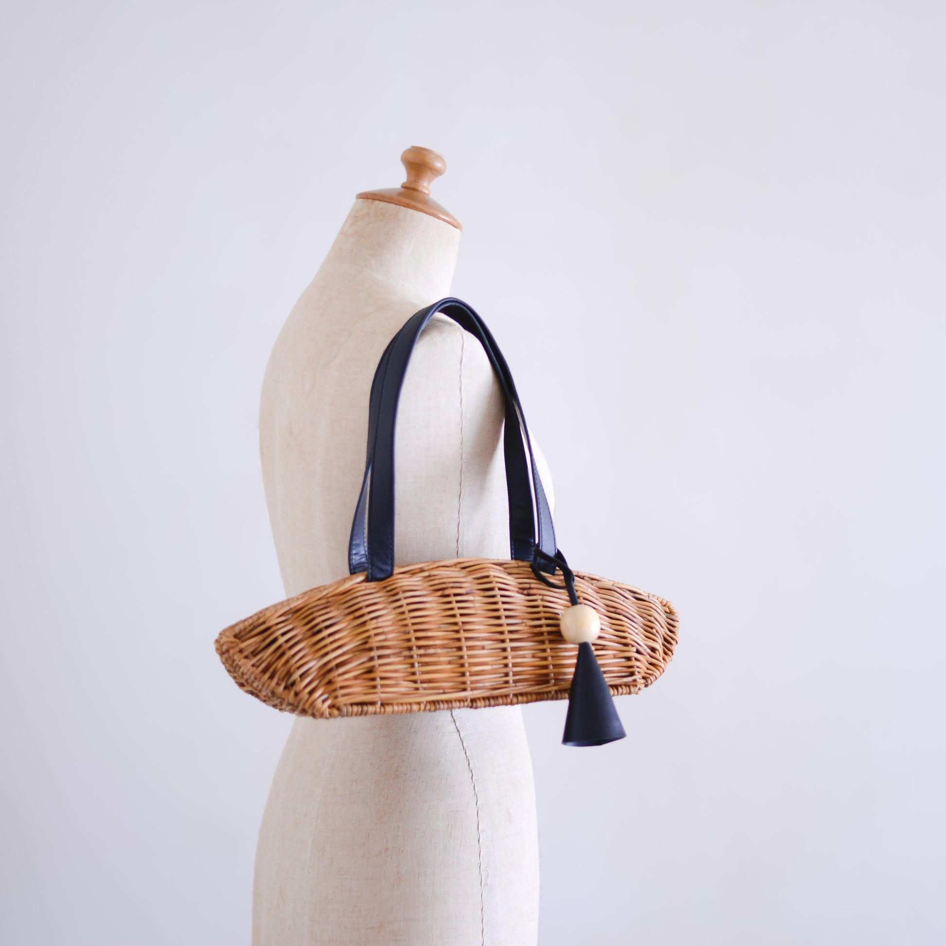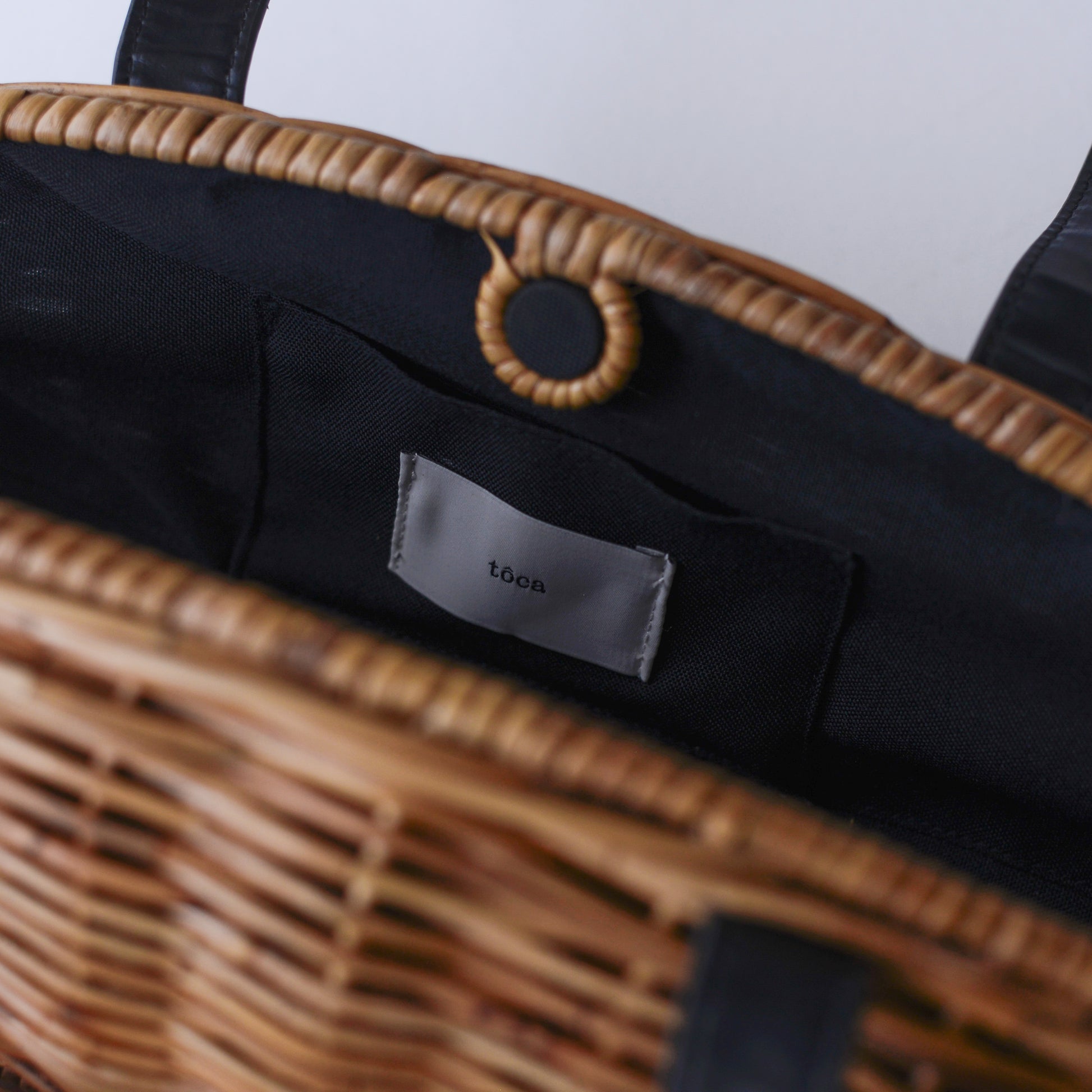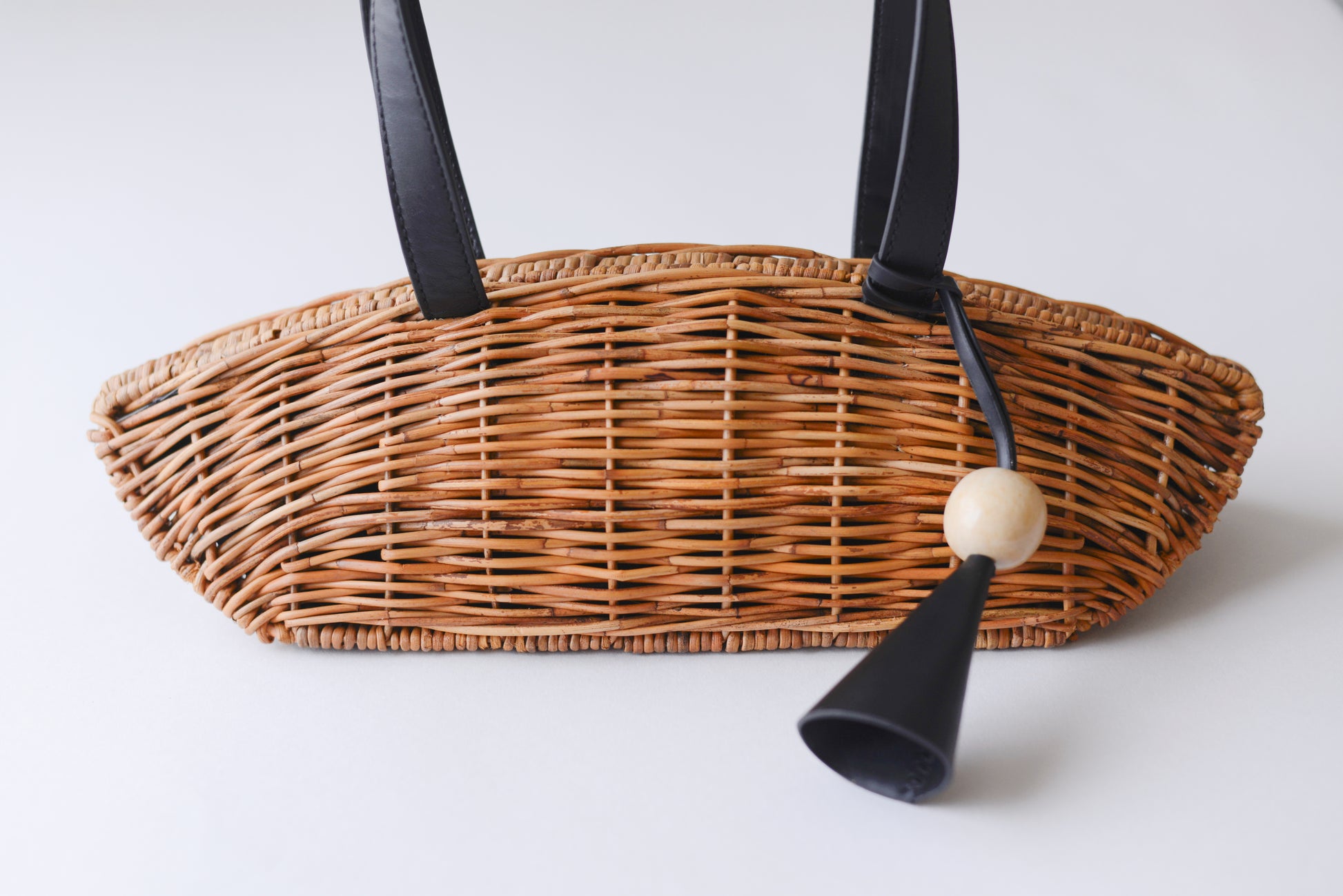 ナチュラルな素材感と黒レザーの端正さが調和した、季節の装いを品よく引き締めてくれるバッグ。