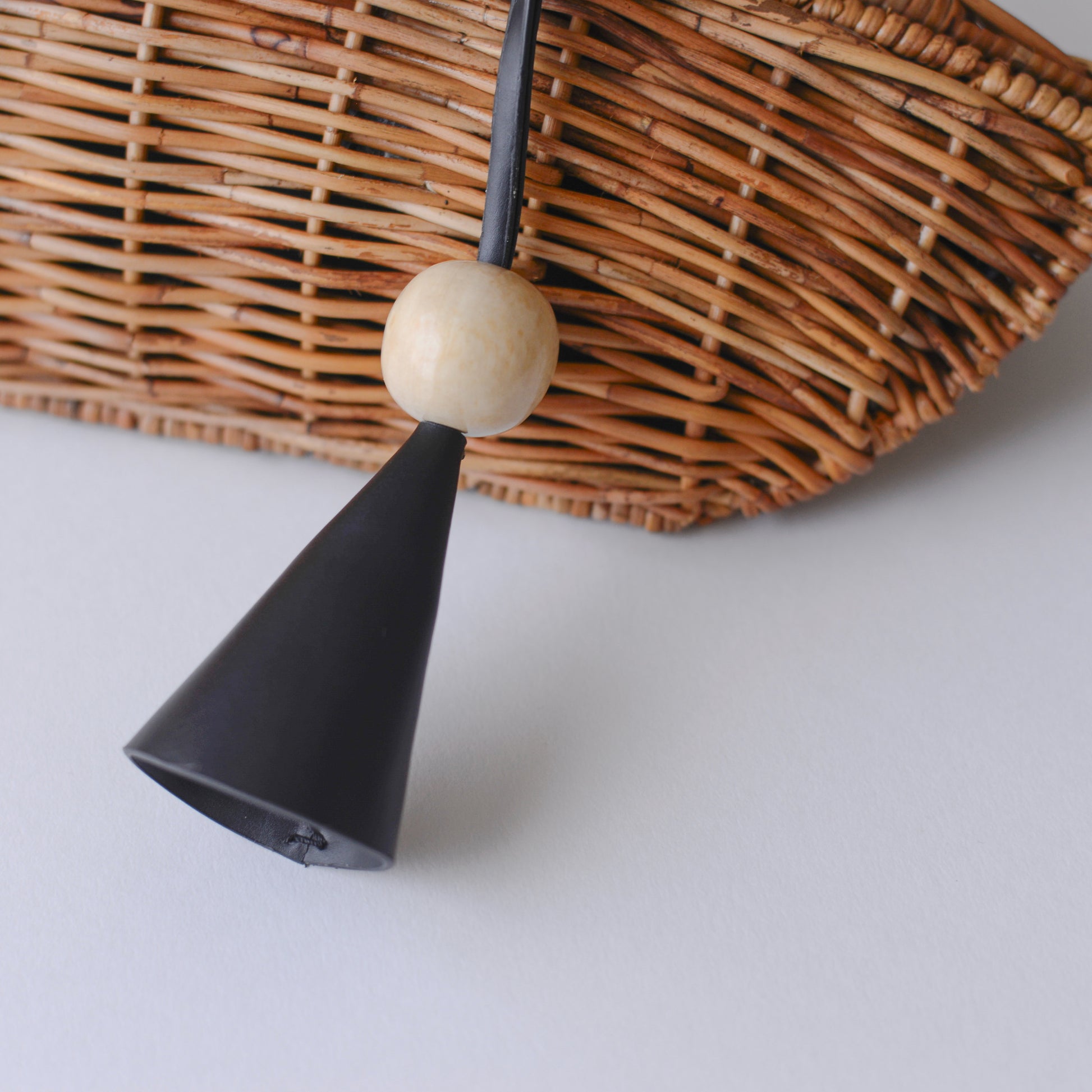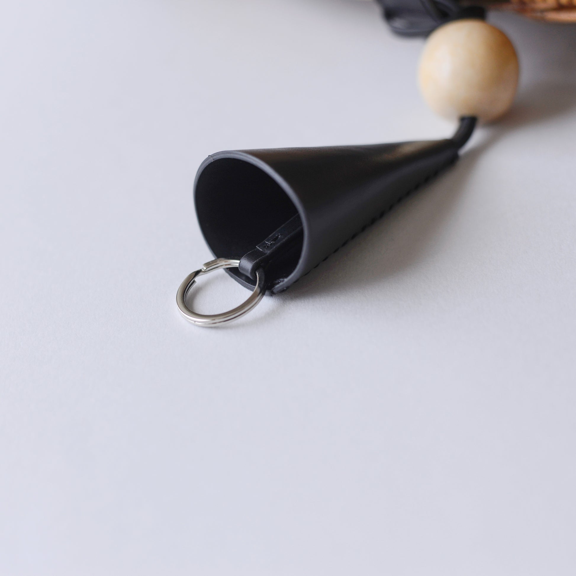 アクセントとして添えたチャームは、革を円錐形に形づくり、木製の球体を組み合わせたモダンなデザイン。