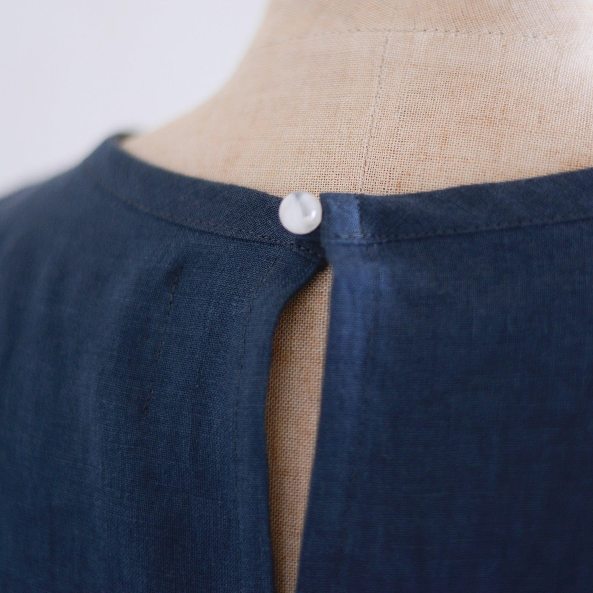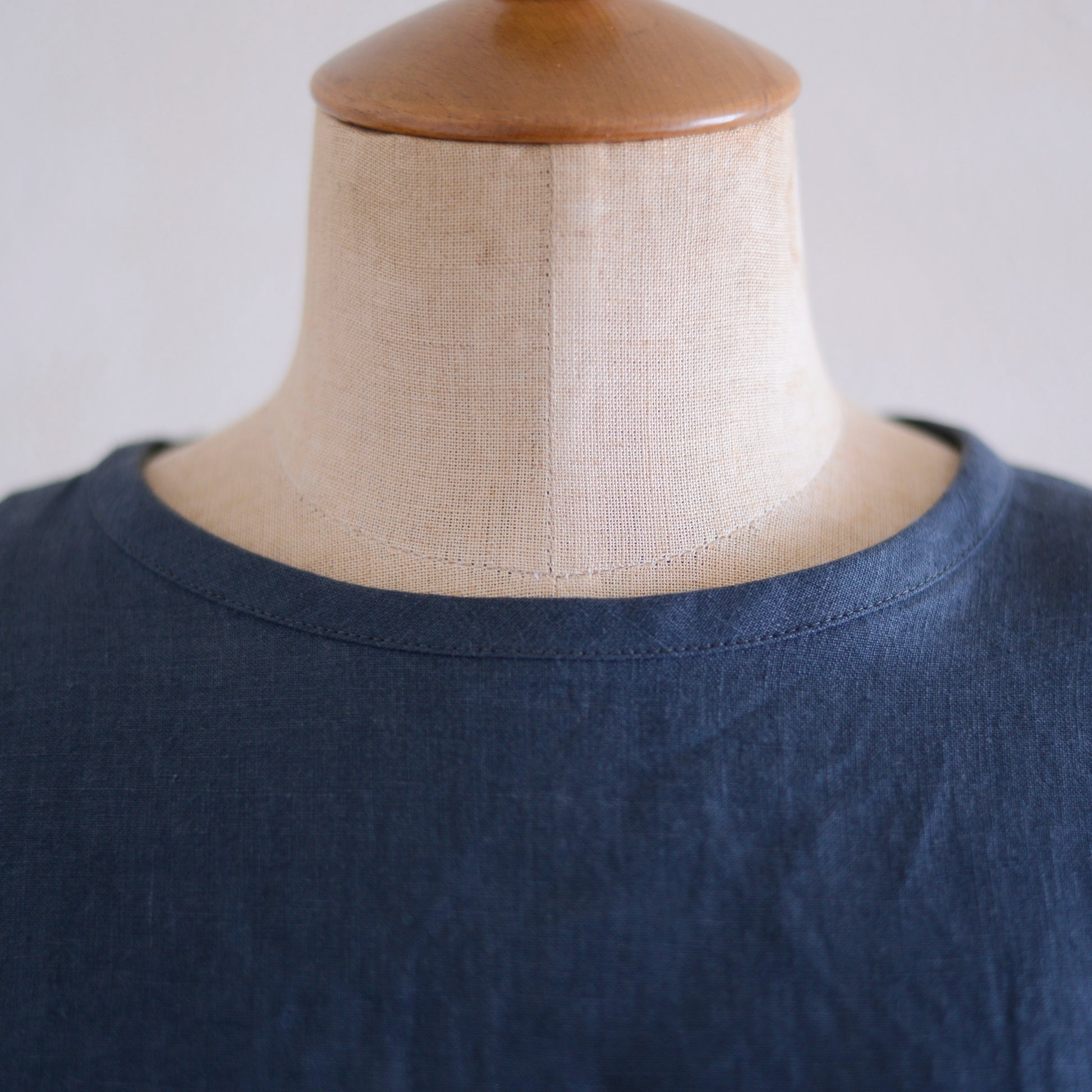 鎖骨が隠れるほどの上品な丸首は、詰まりすぎず涼しく着られる絶妙なバランスです