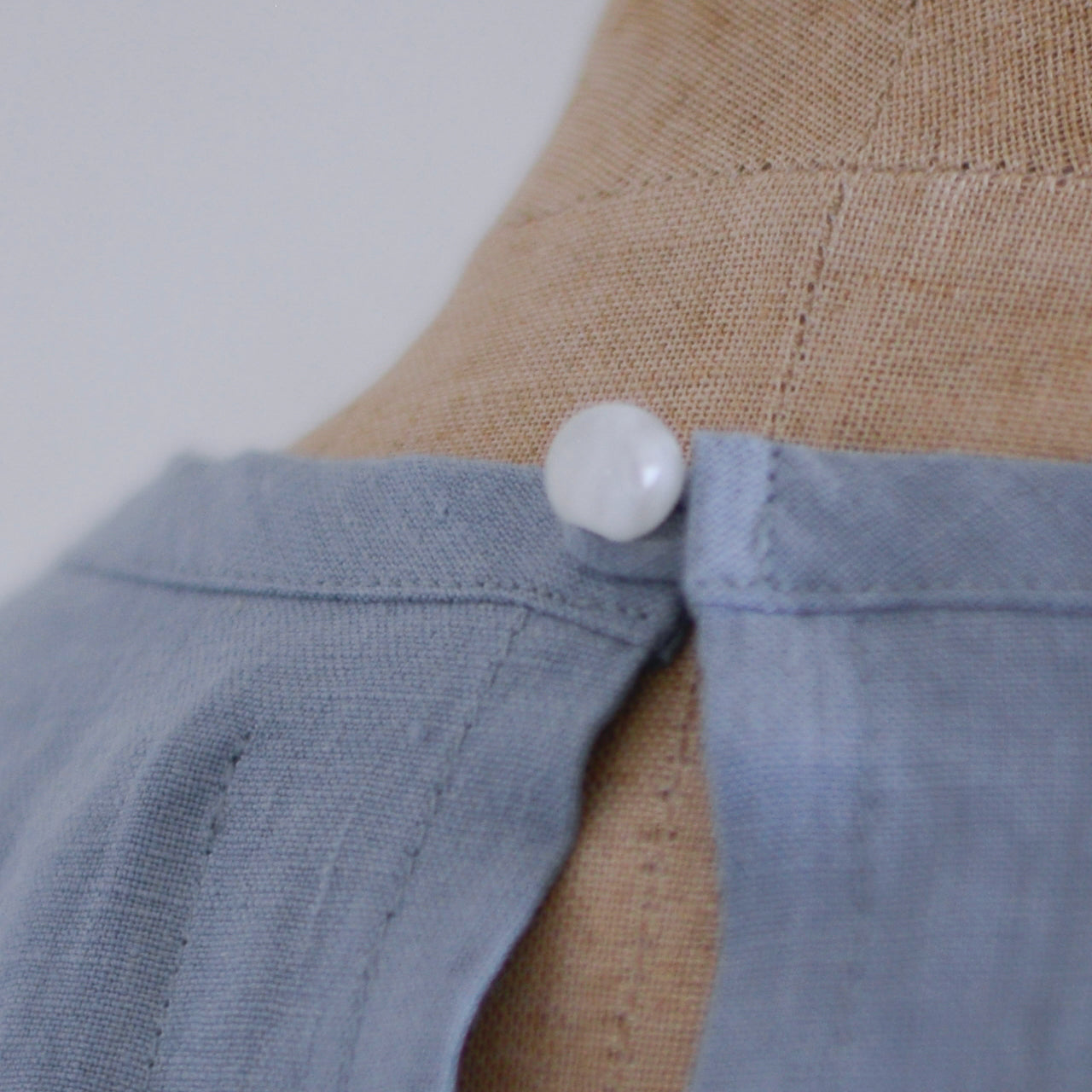 襟首には深めの切り込みと、それを留める小さな球体のガラスボタンをひとつ。