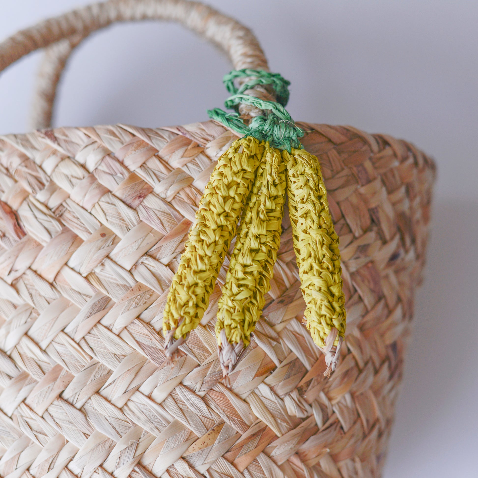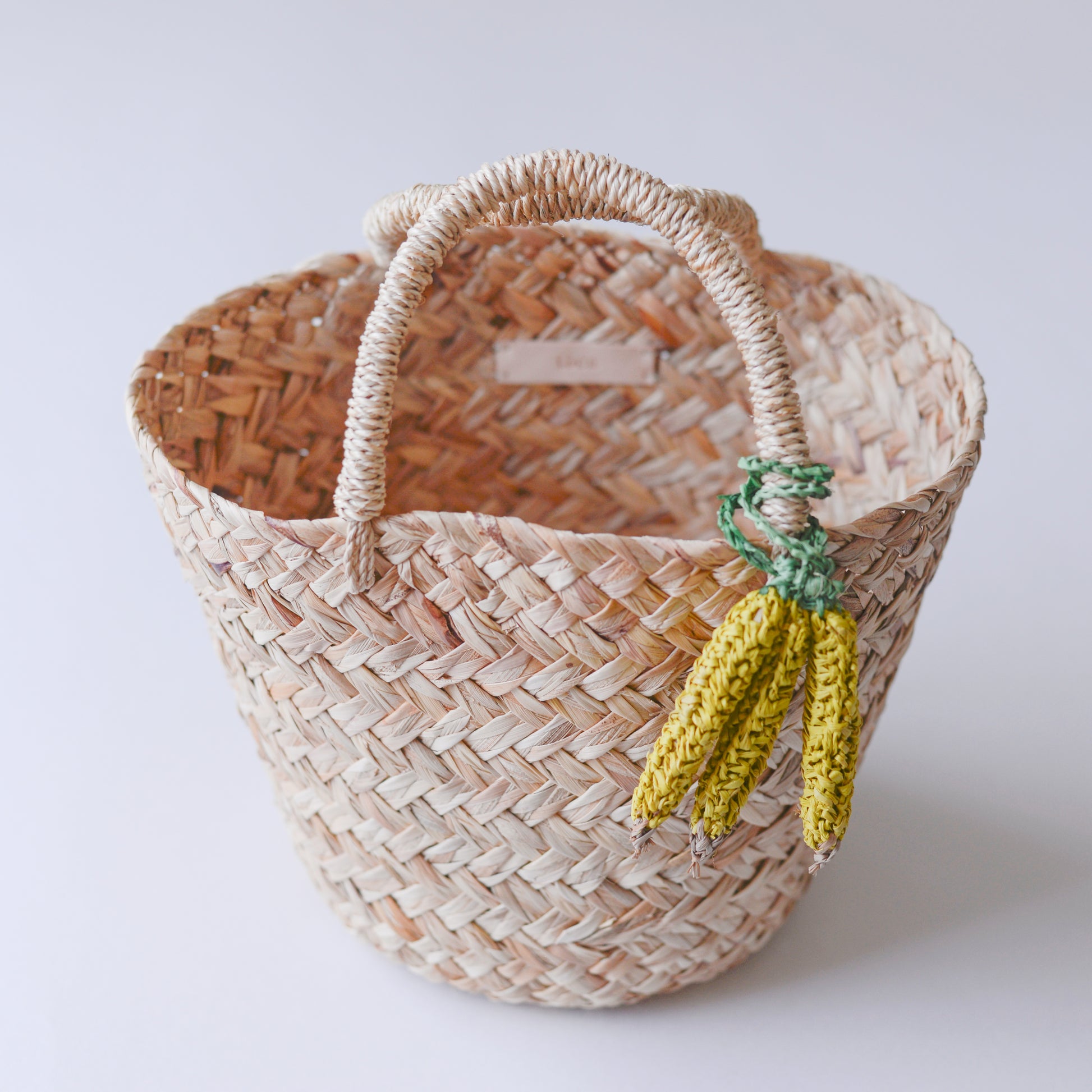 象・ブドウ・バナナの立体的に編まれたチャームは、ナチュラルな編み地に可愛らしい表情を添えてくれます。