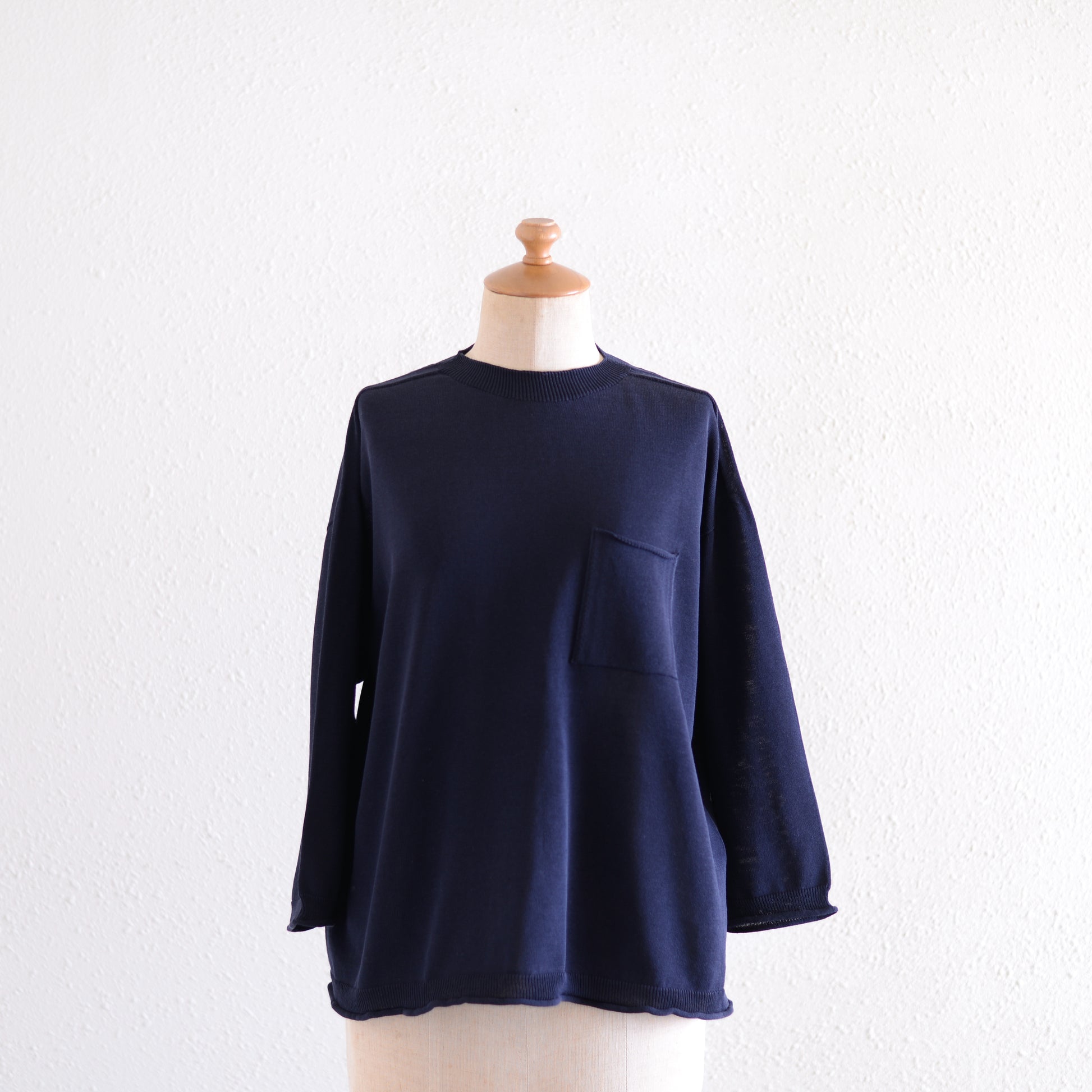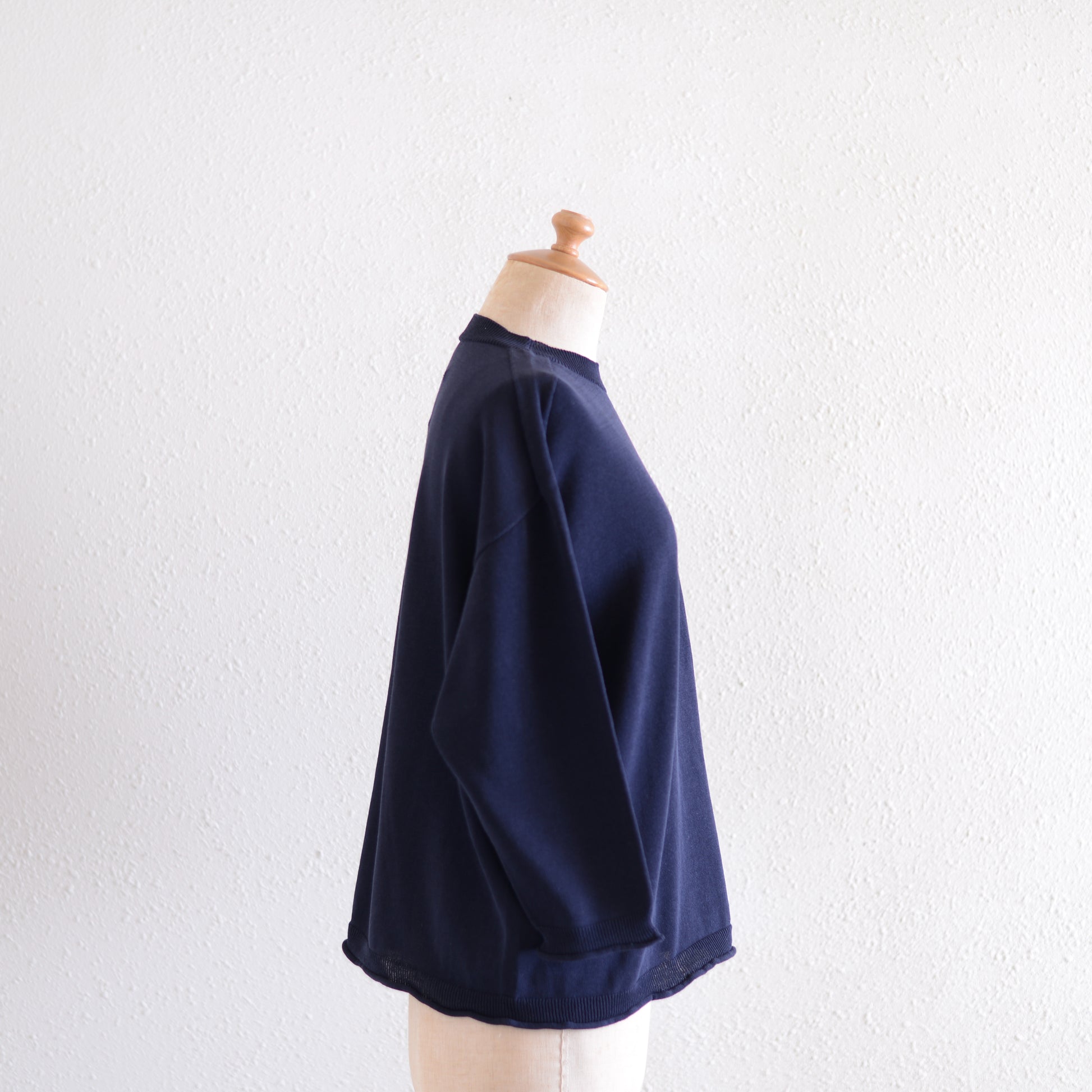 スリーブは肘と手首の中間あたりにくる七分丈で、手首まわりをすっきり見せ、家事やデスクワークの邪魔にならない実用性も兼ね備えています