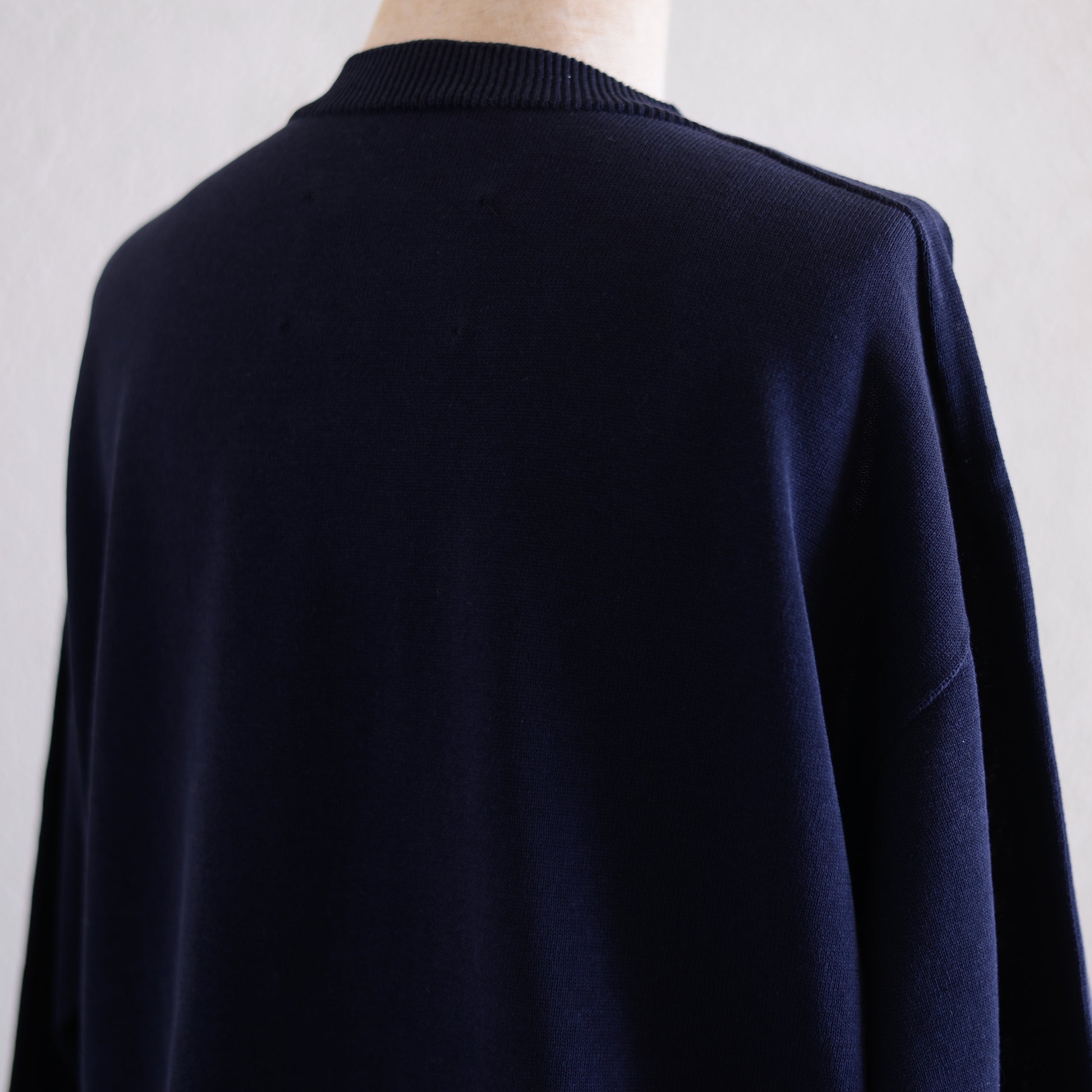 少し肩の落ちたドロップショルダーゆとりのある身幅が相まってボディラインを拾わないすとんとまっすぐ落ちるシルエット