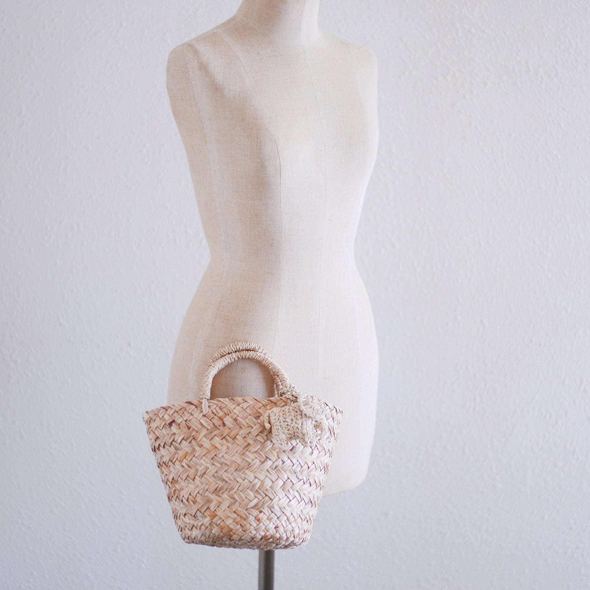 バッグは、フィリピン原産のバショウ科植物から採れる天然繊維、アバカ(ハンドル)とルピス(本体)を使って編み上げています。