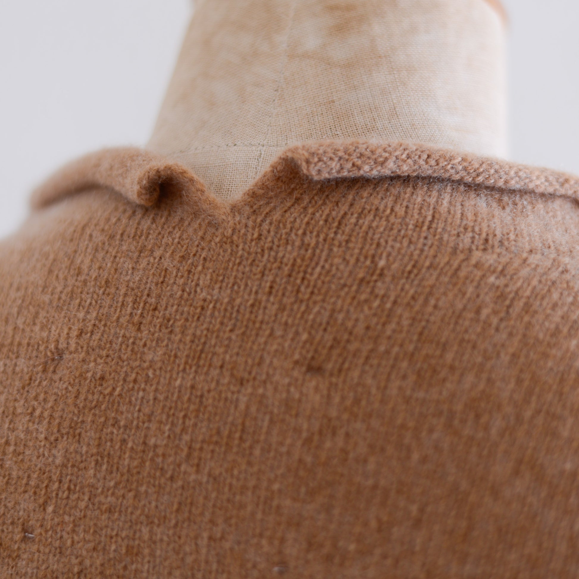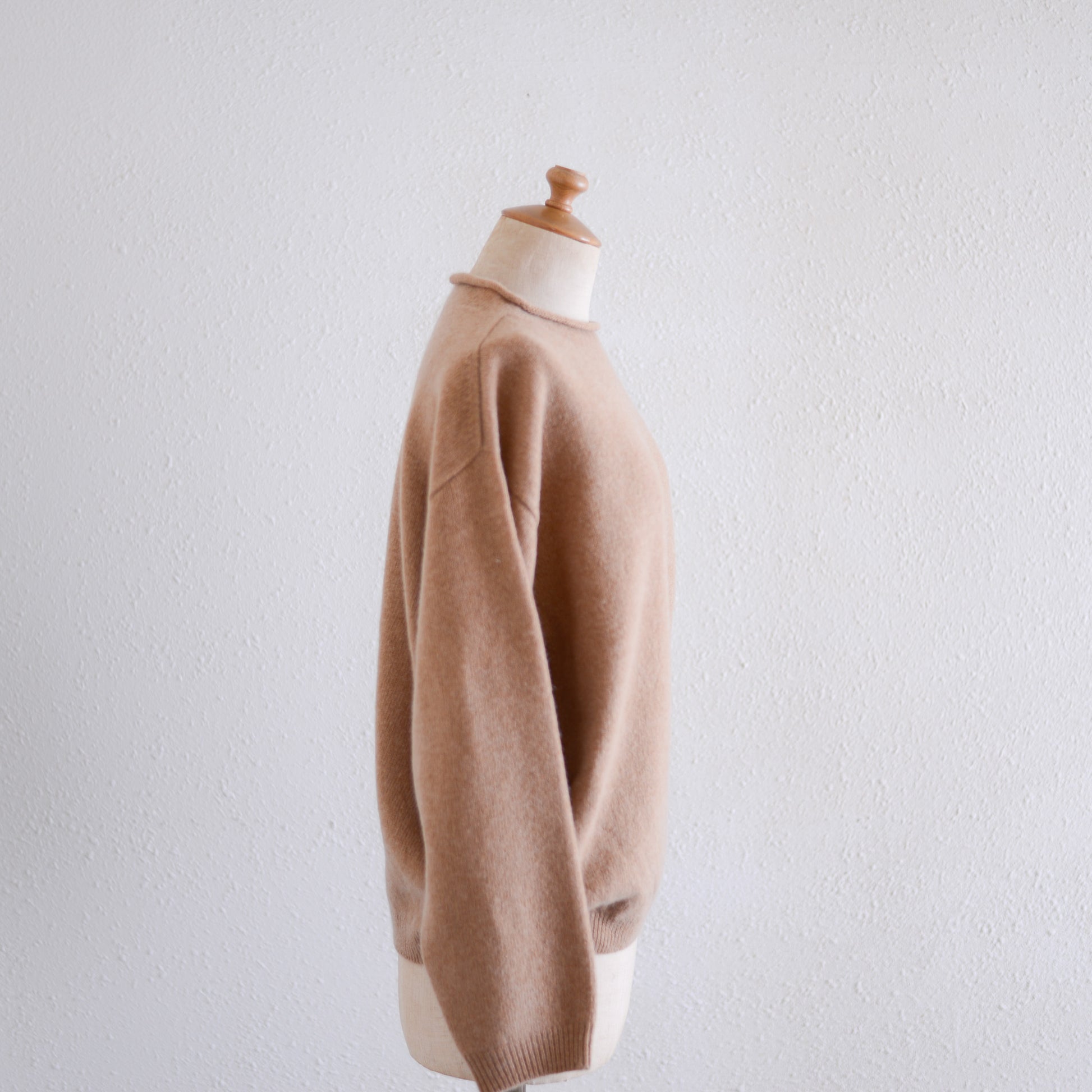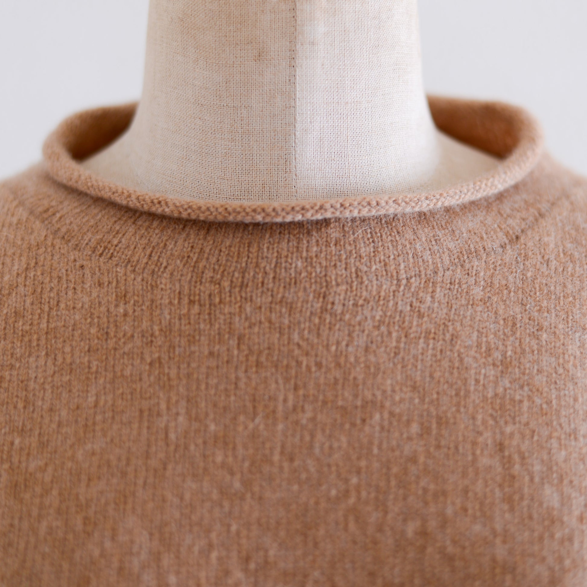 袖口と裾にはリブ編みを施し、全体のフォルムを適度に引き締めながら、