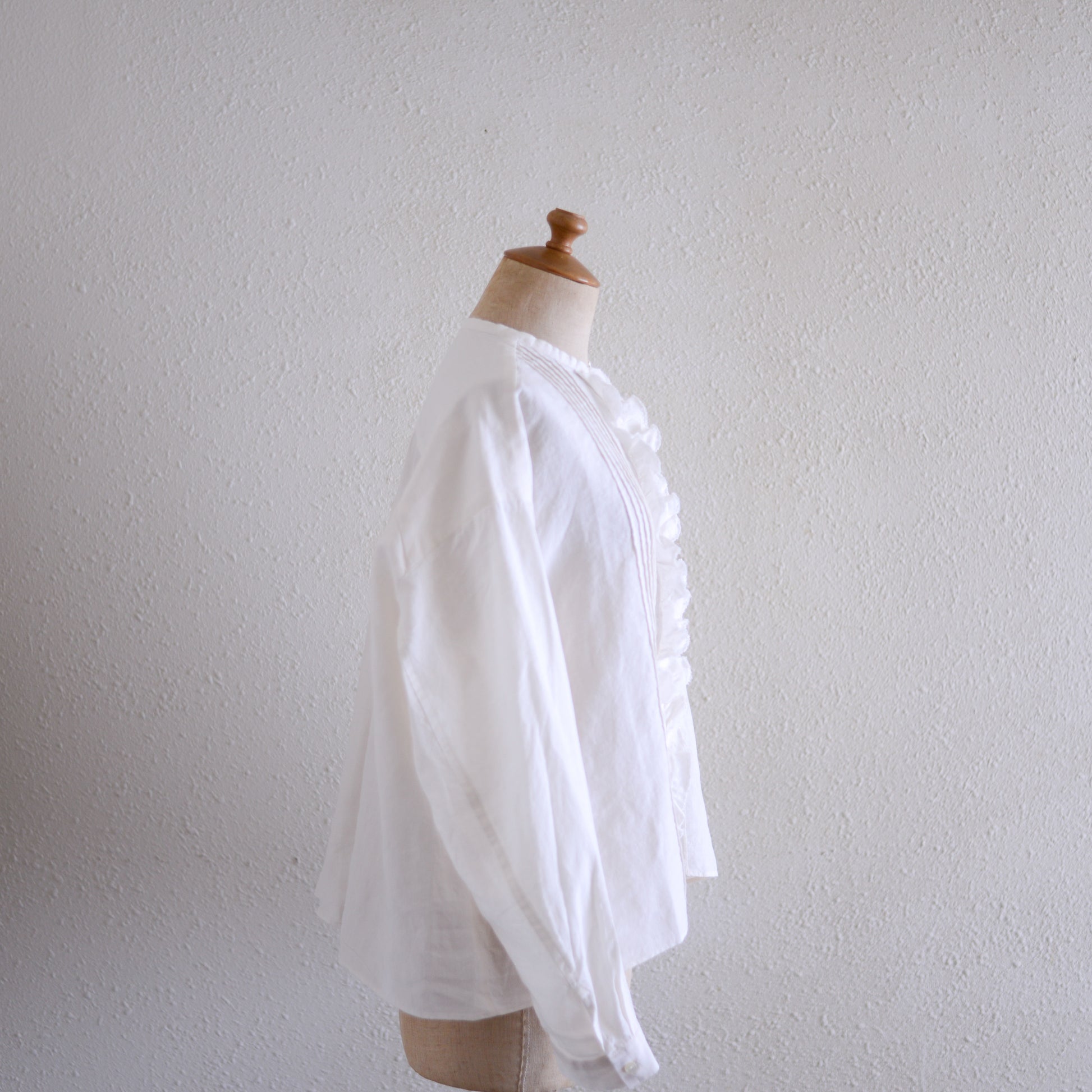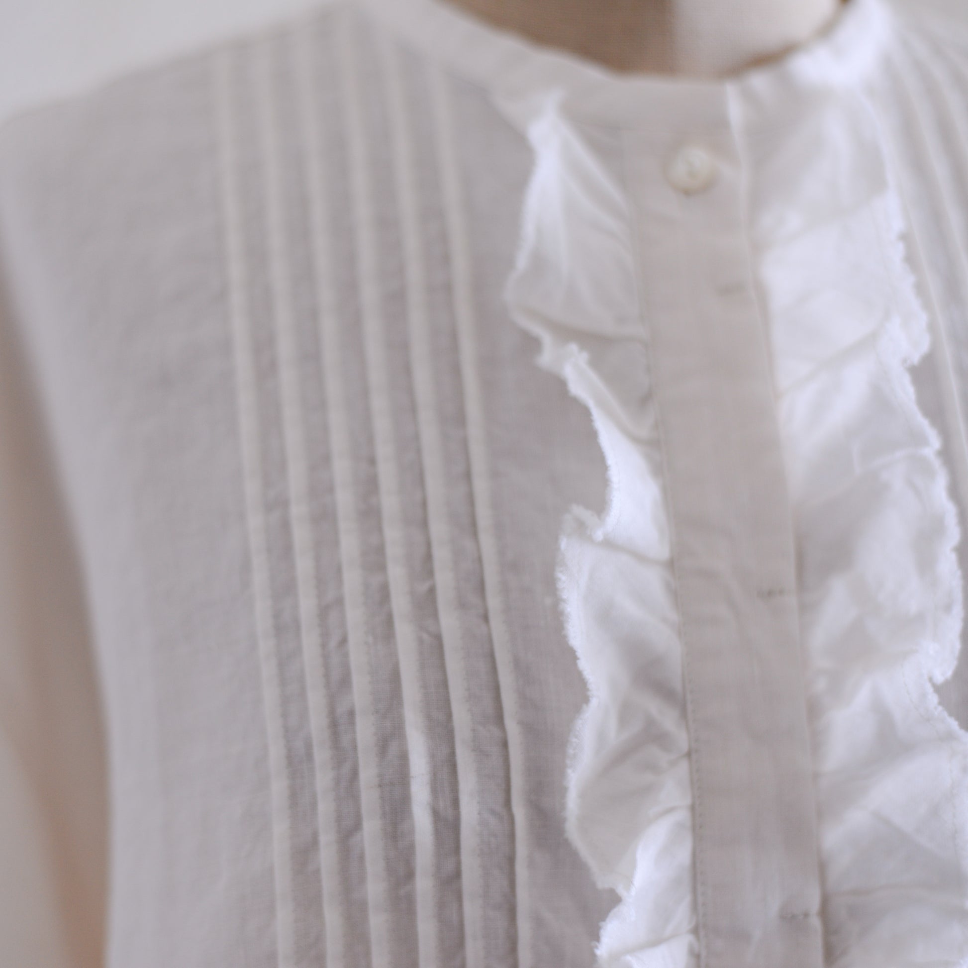 前身頃の中央には、立体的なフリルとタックを丁寧に重ね、甘くなりすぎず表情のあるデザインに仕上げています