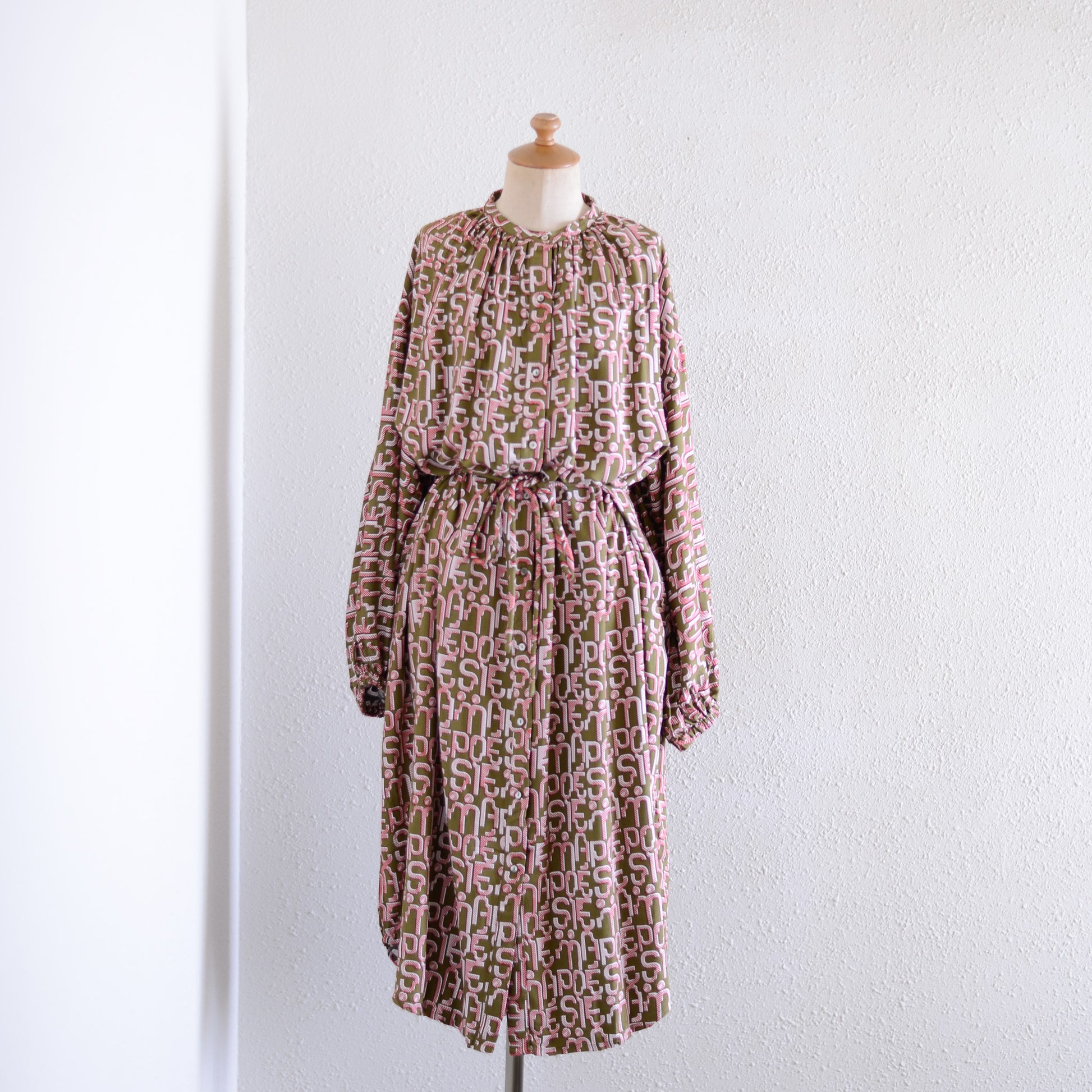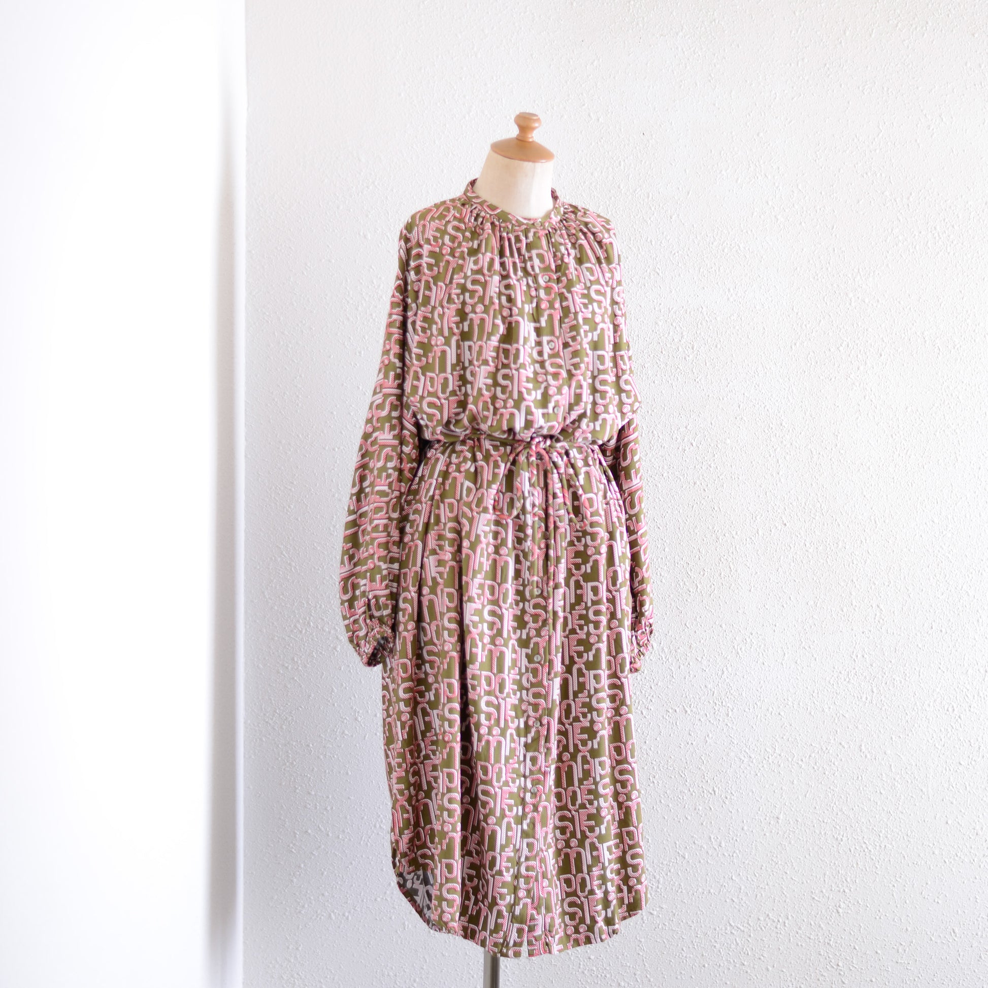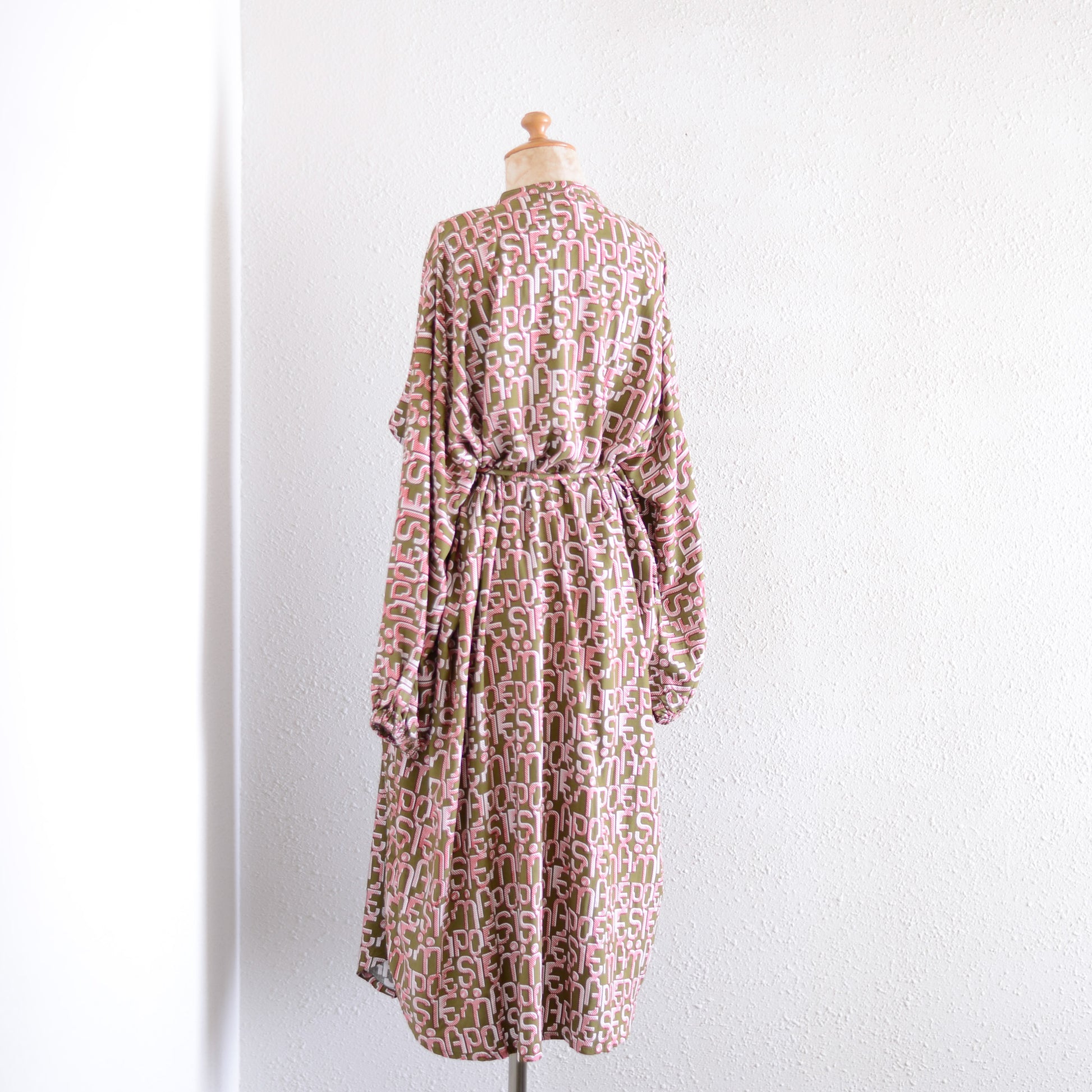 비스코스 텍스트 프린트 원피스 카키×핑크