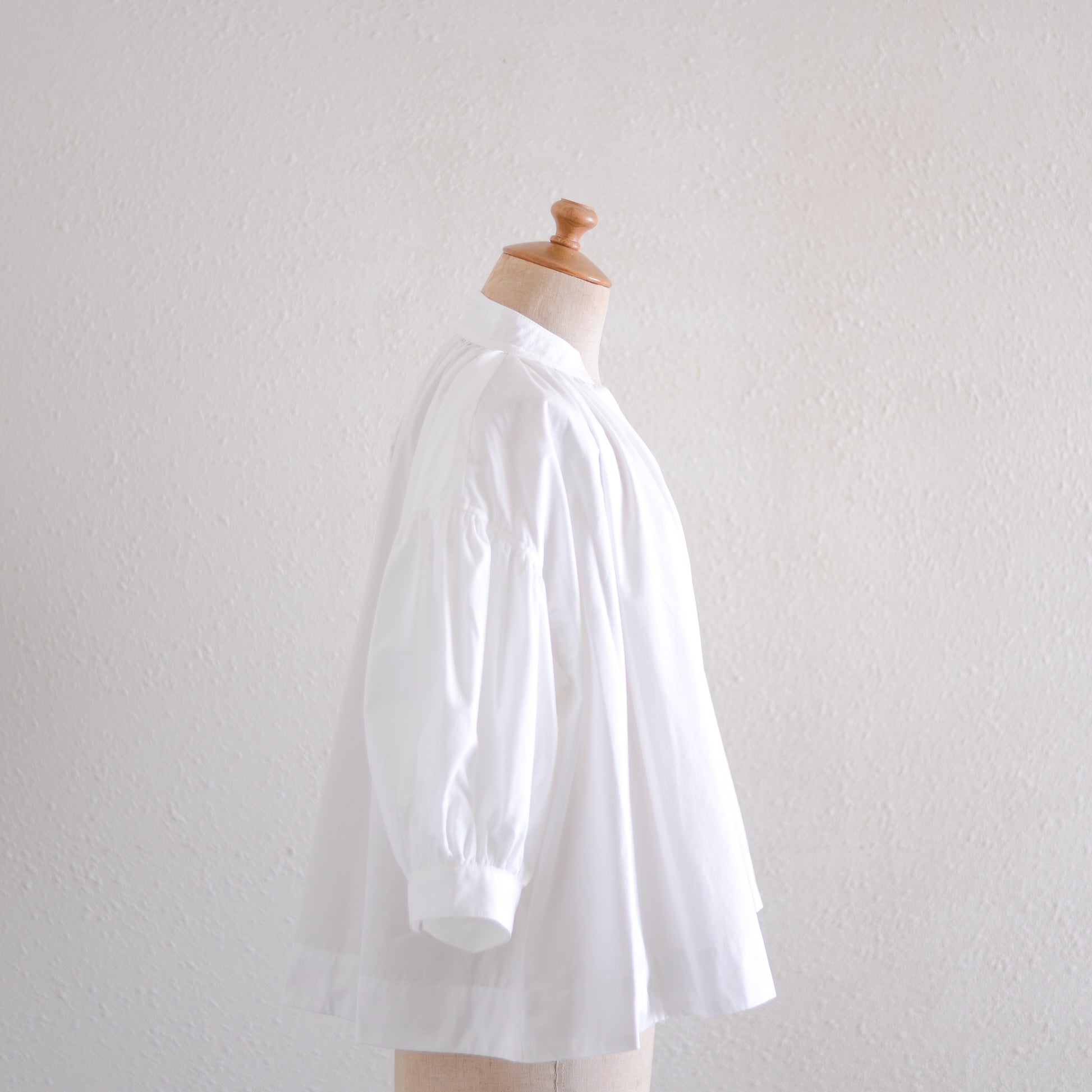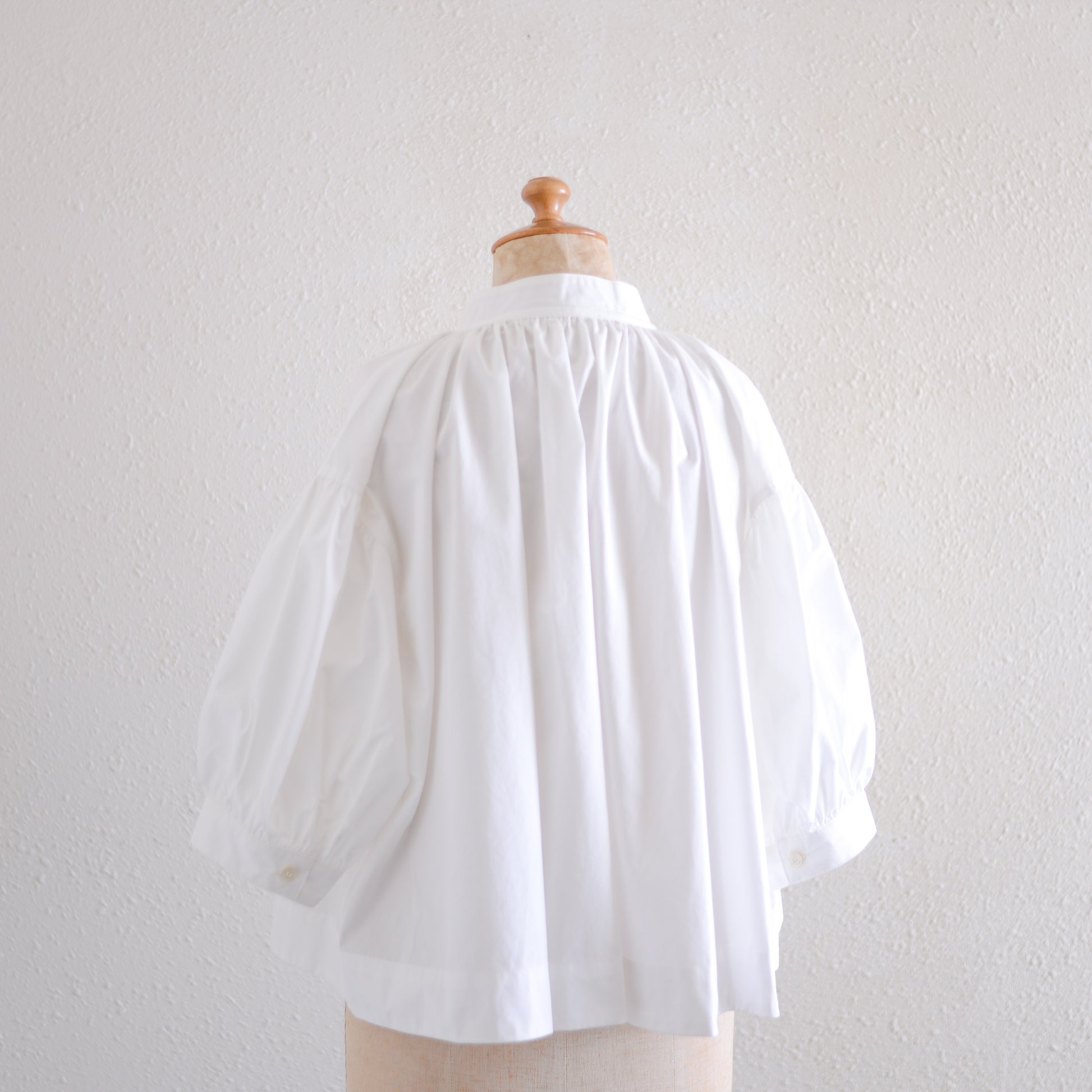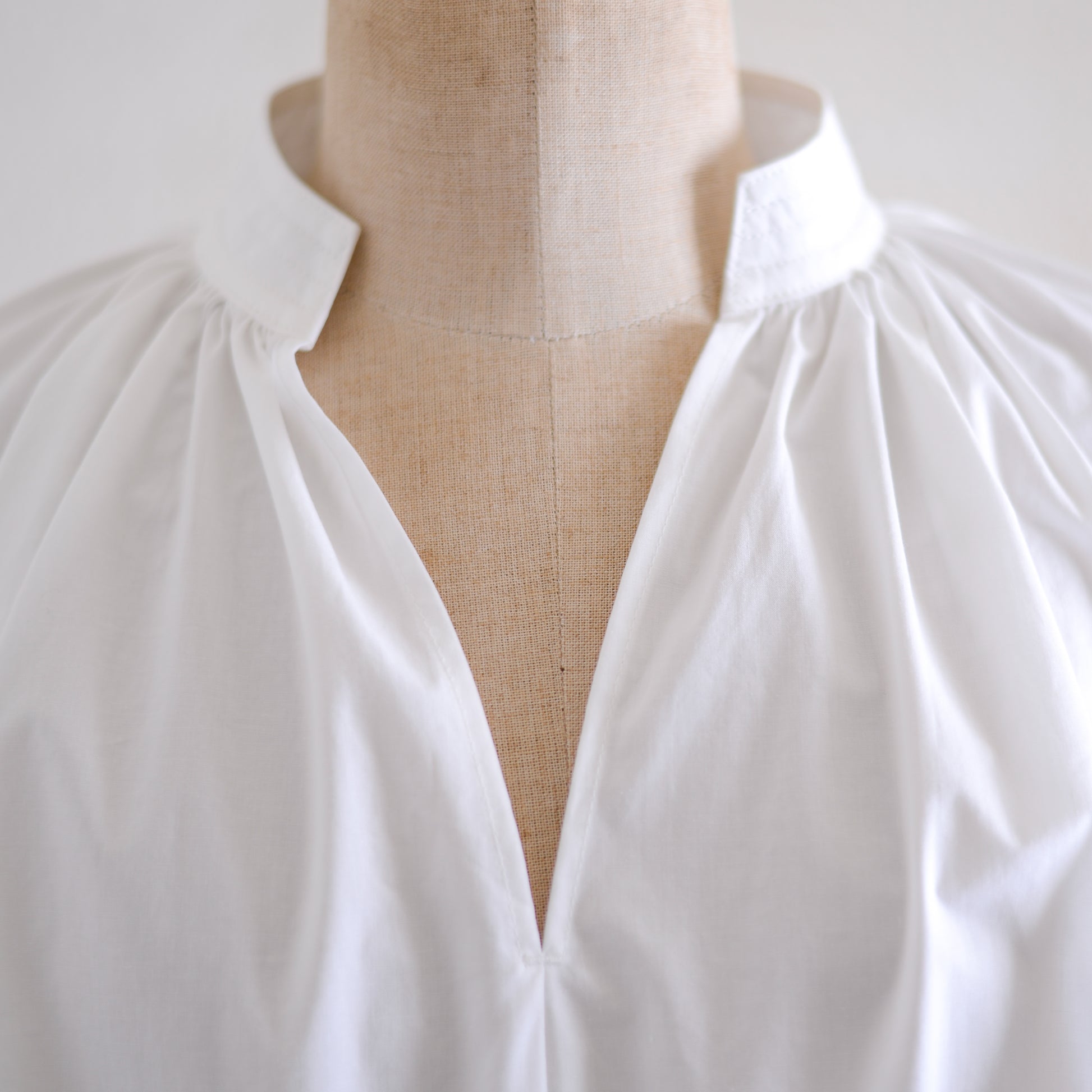 首元から細かく寄せたギャザーと、ドロップショルダーの落ち感が作るラインは、肩まわりをふんわり包み込み、自然な陰影をプラス