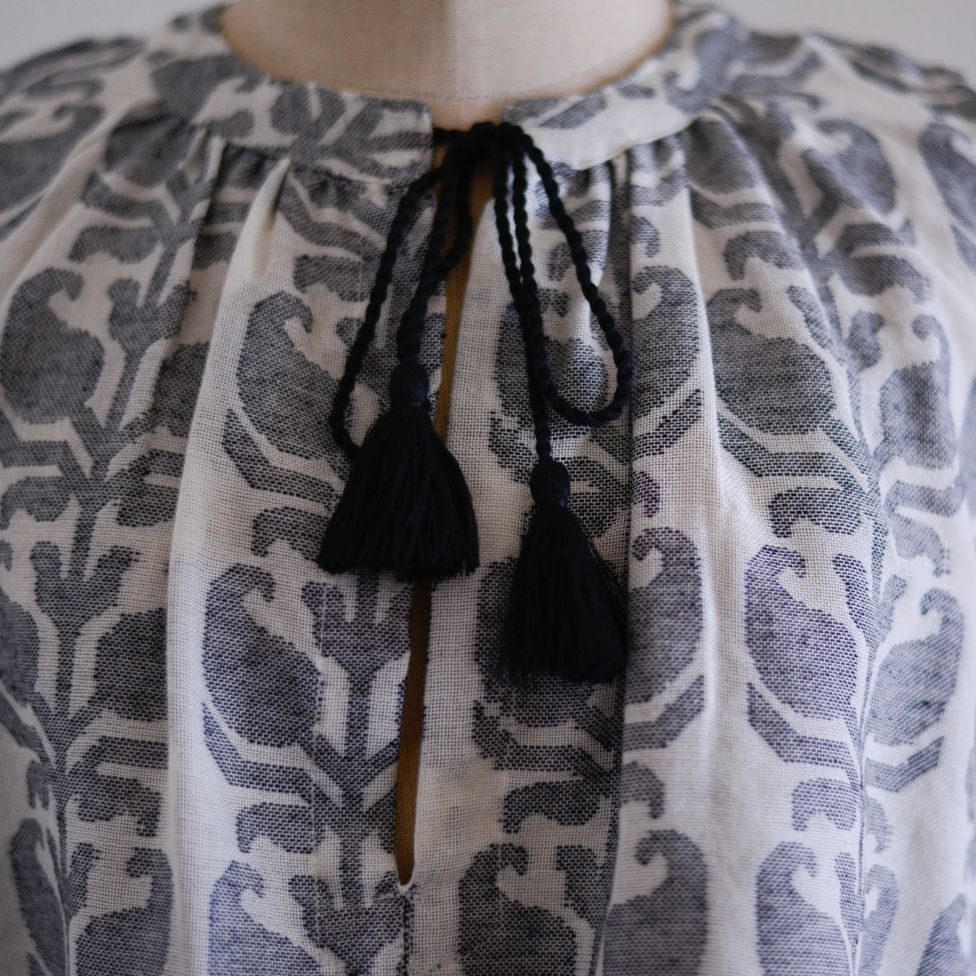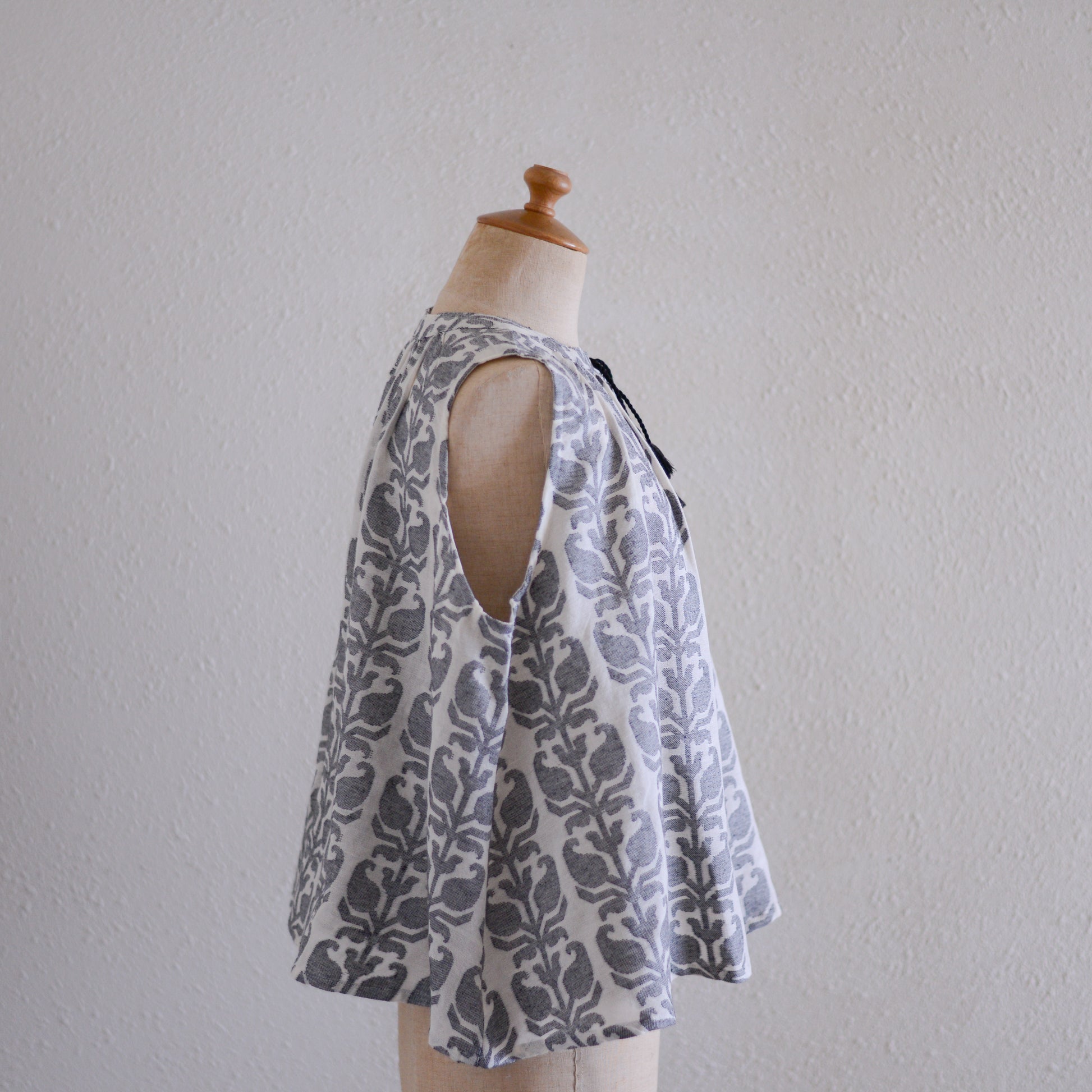 丸首のすっきりとしたネックラインから、細かなギャザーがふわりと広がるデザインに仕上がっています。