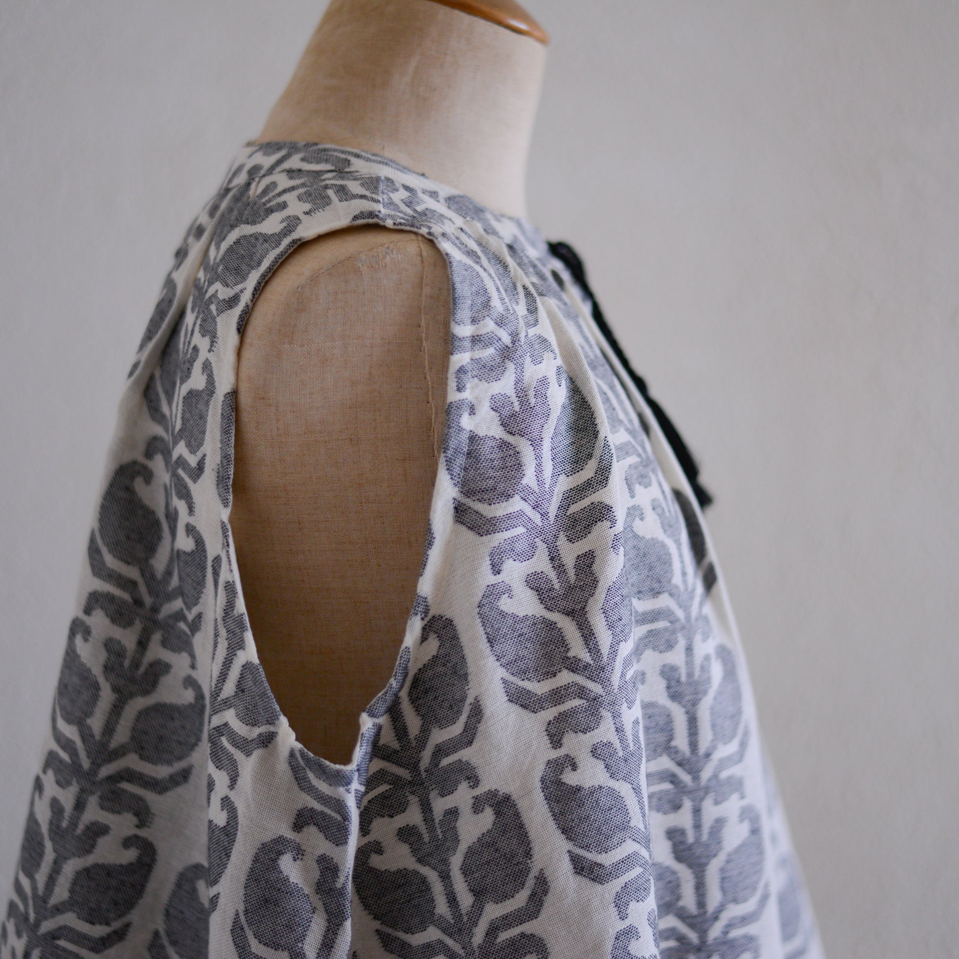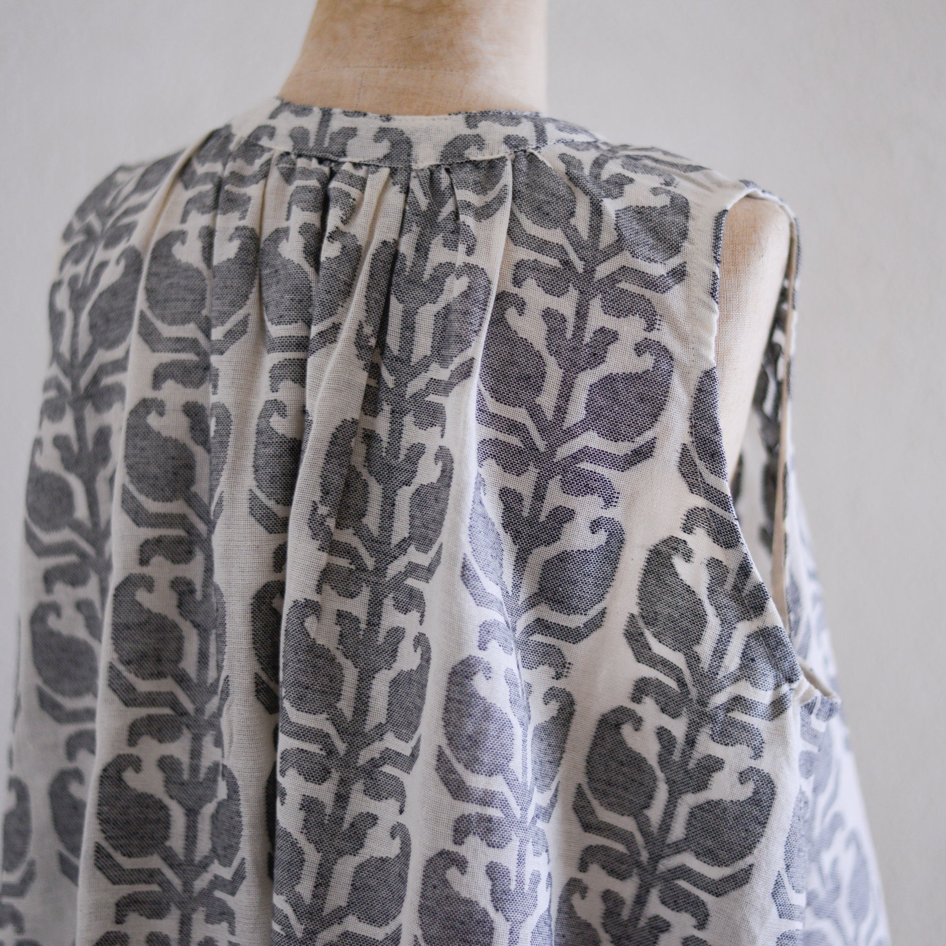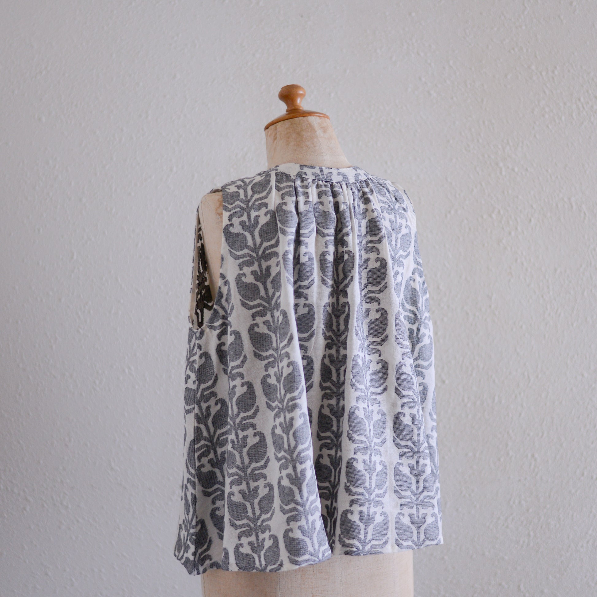身頃はたっぷりとギャザーを寄せた幅広なつくりで、身体のラインを拾いにくく、風をはらむたびに揺れるAラインシルエット。