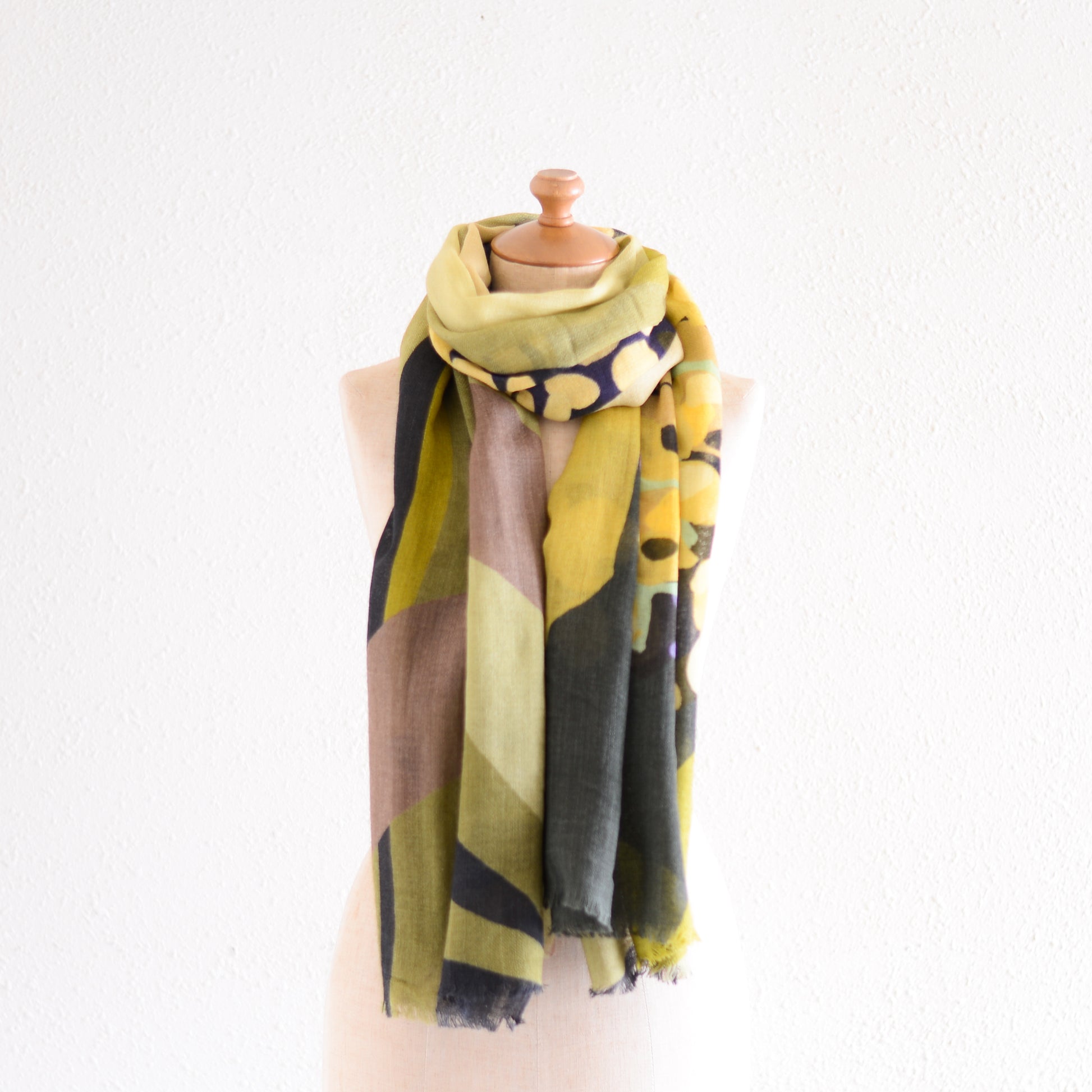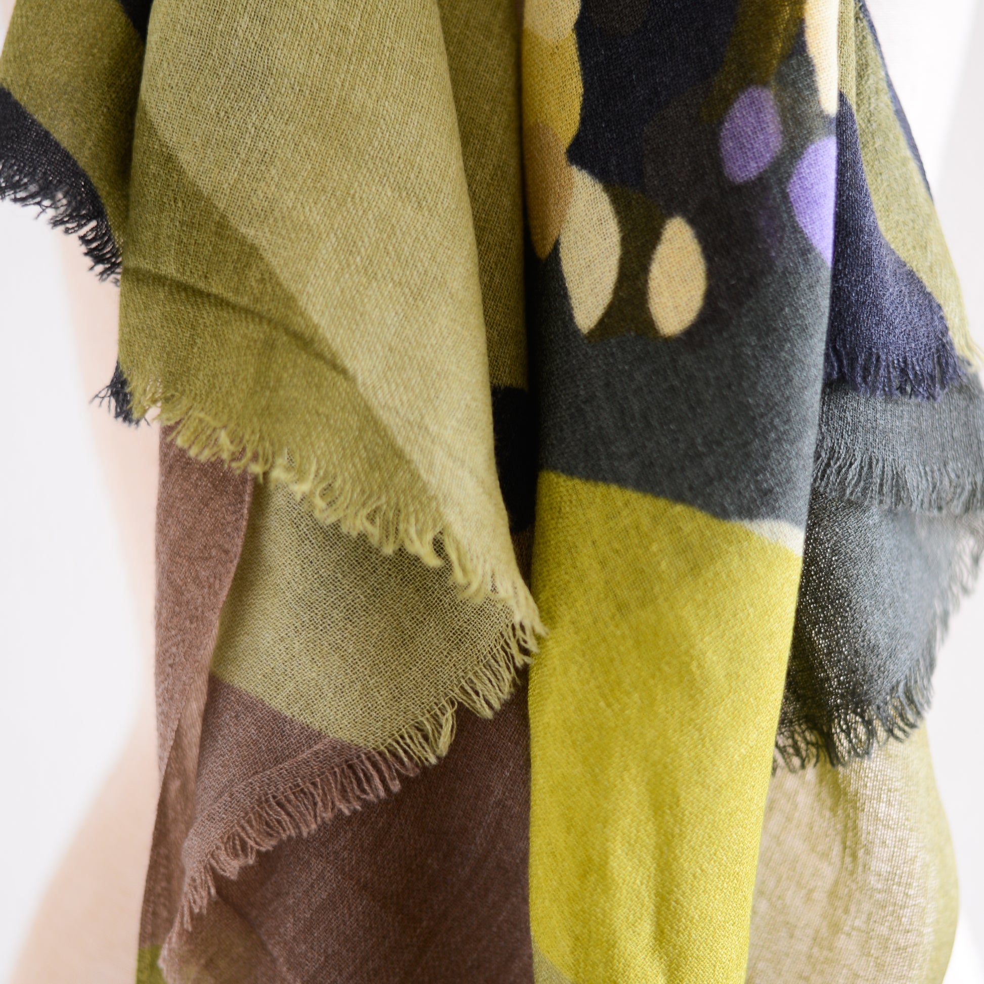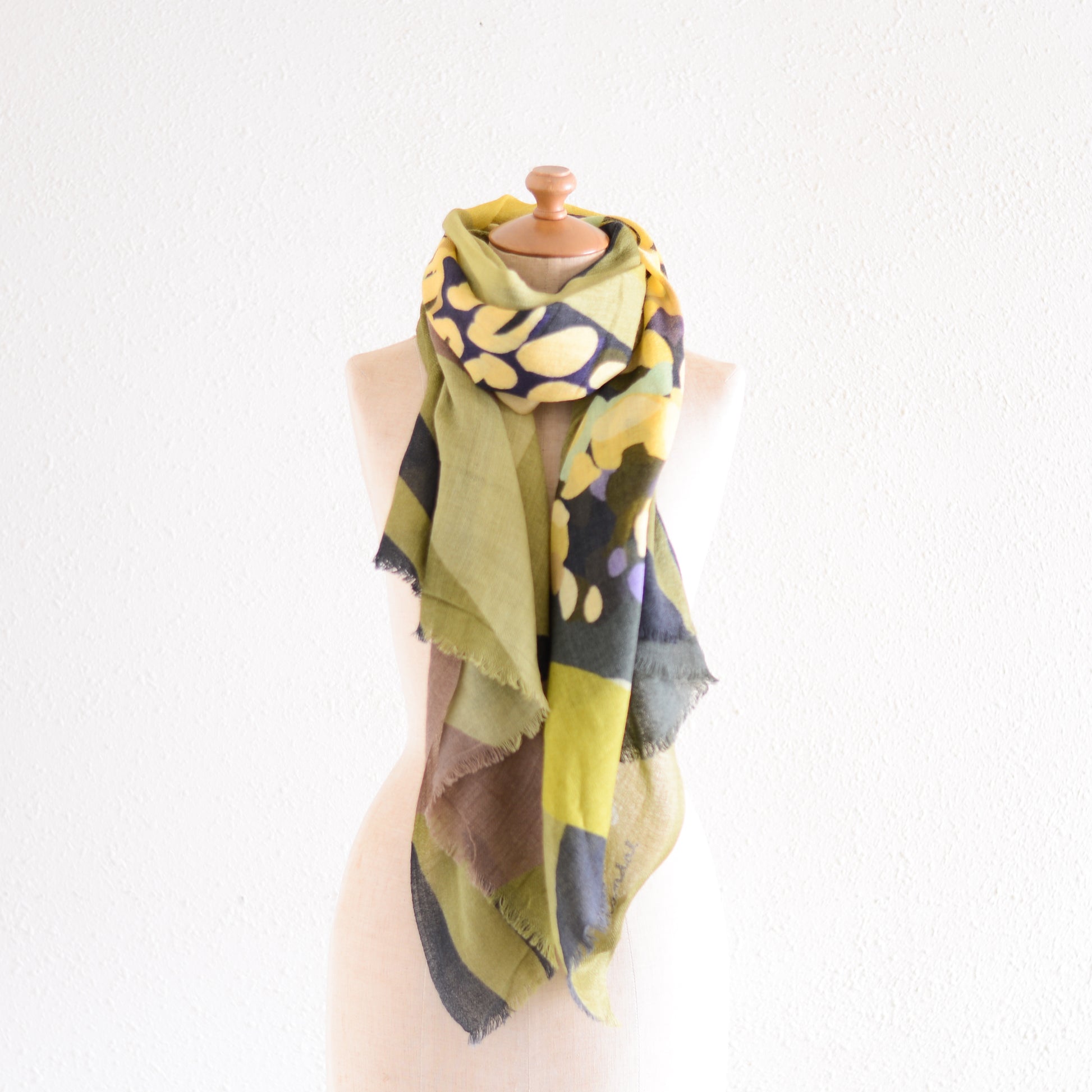 肩に掛ければ、ショールとして絵画のような存在感を放ち、首に巻けば、色のレイヤーが立体的に重なって美しいハーモニーが生まれます。
