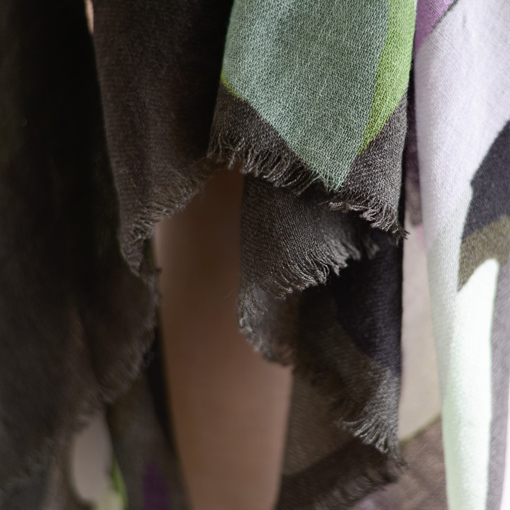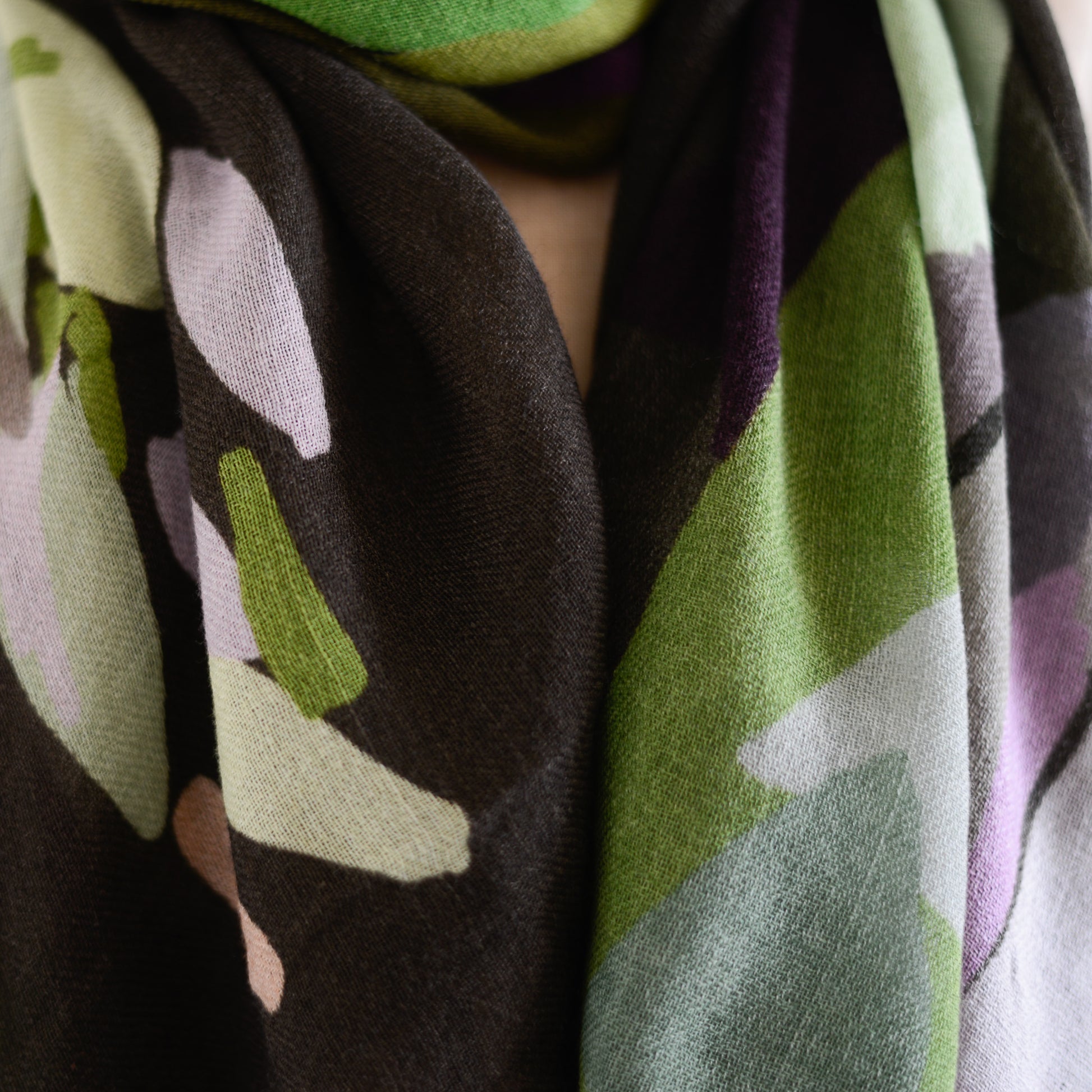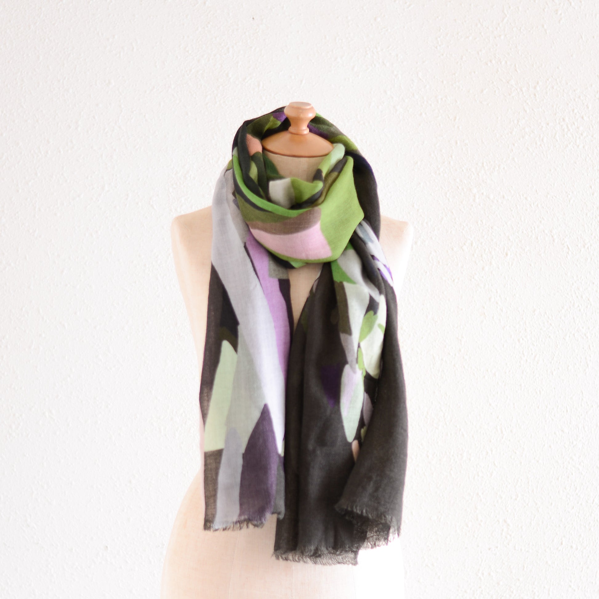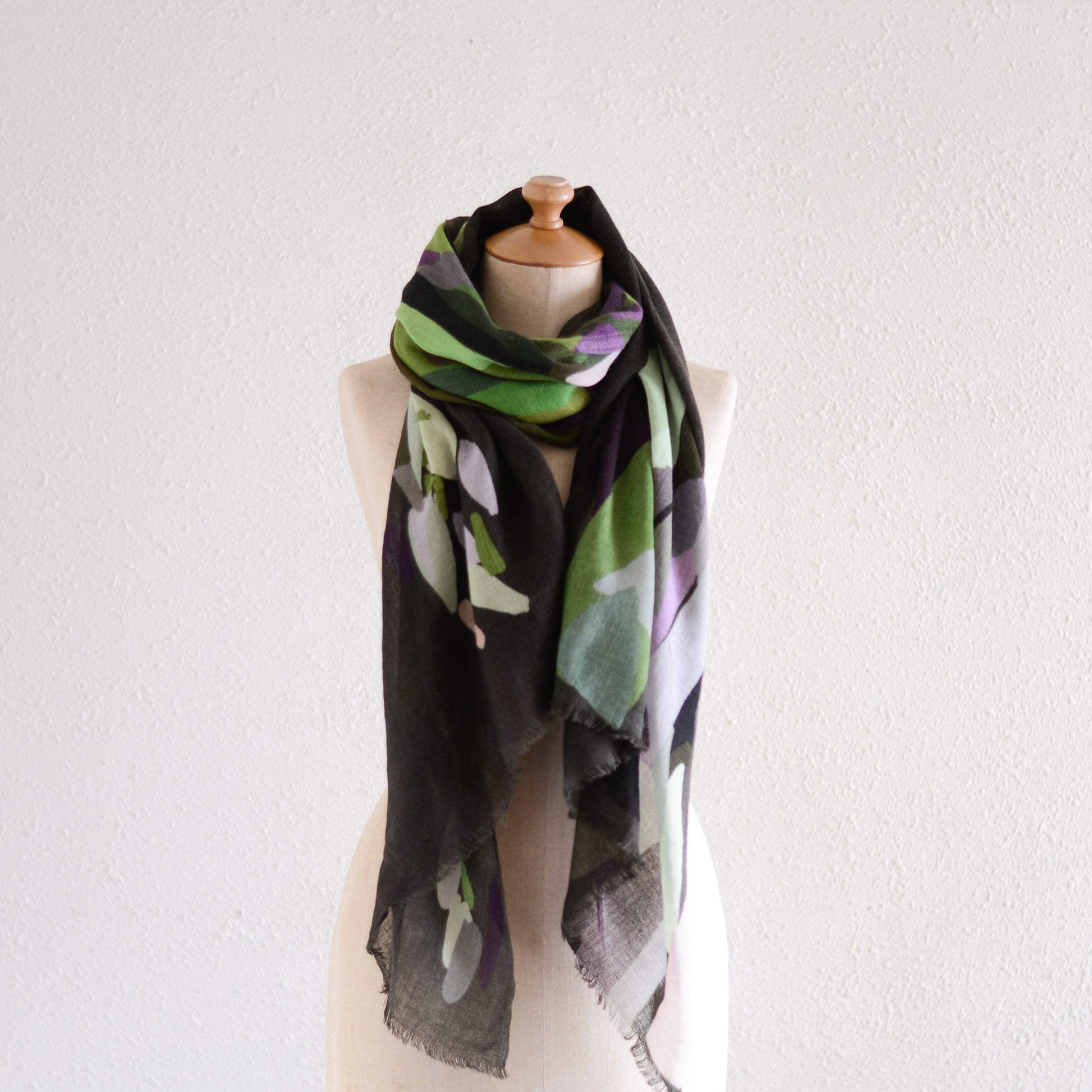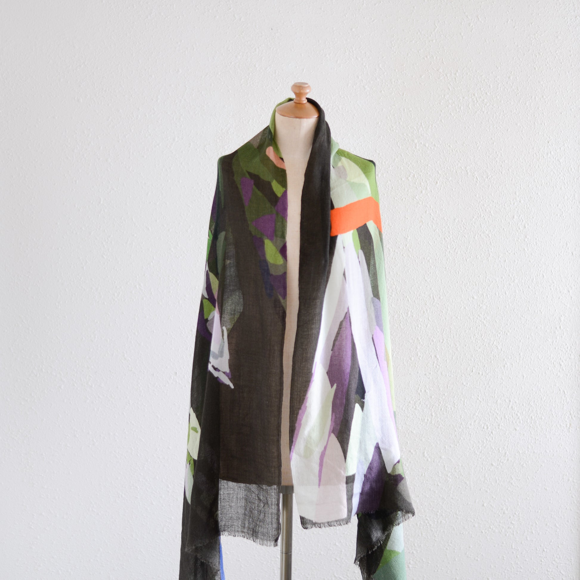 肩に掛ければ、ショールとして絵画のような存在感を放ち、首に巻けば、色のレイヤーが立体的に重なって美しいハーモニーが生まれます。