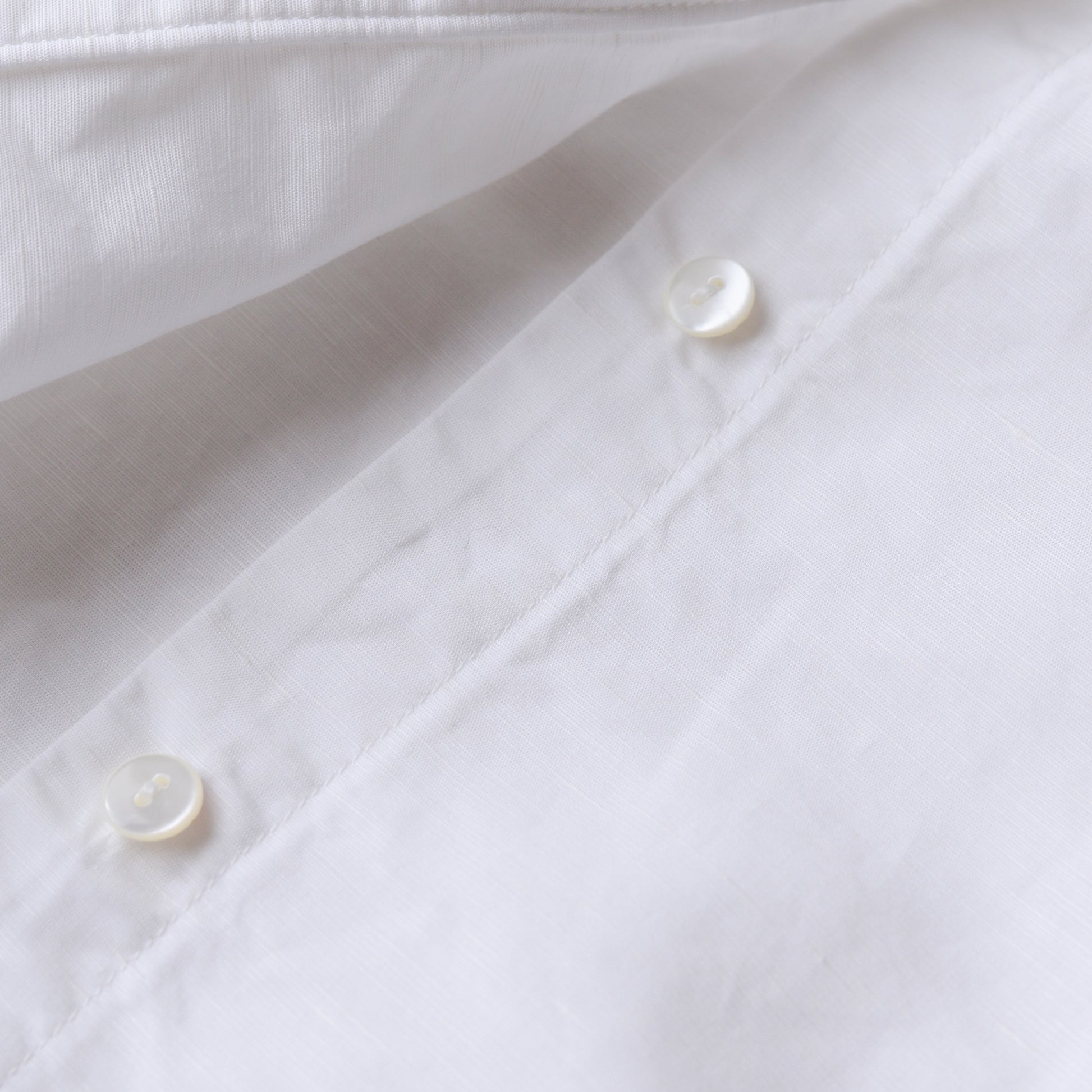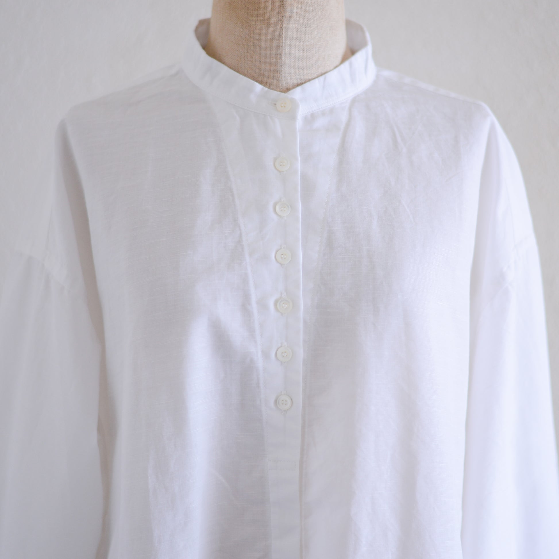 バンドカラーのすっきりとした首元に、乳白色の小ぶりなボタンが静かに連なるフロントは、胸下からは比翼仕立てになっており、上品で洗練された印象をつくります。