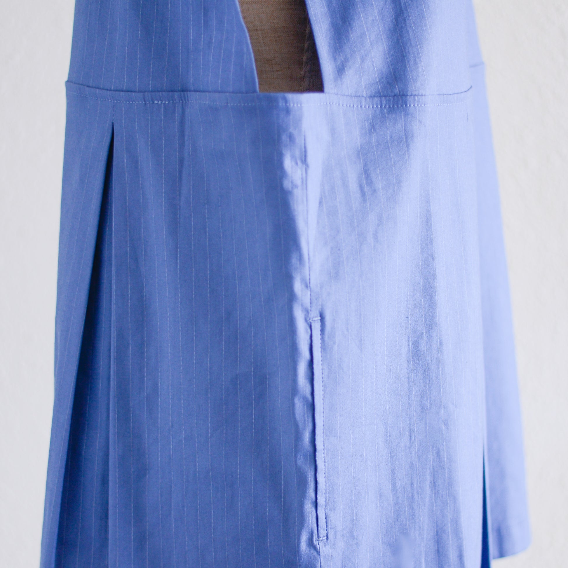生地には細かなピンストライプが織り込まれ、近くで見るとわかる控えめな表情が、装いに奥行きを生み出します。
